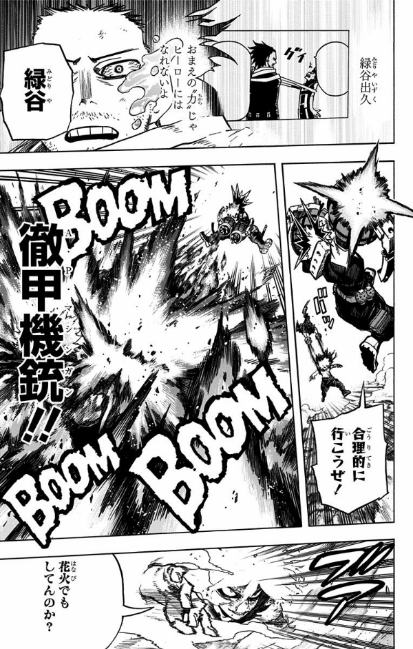 デッカい男のせいで、辺り一帯がメチャクチャ! 「主のもとへ」って、死柄木? ……ダメ! こいつが街に降りたら、ひとたまりもない! 雄英生も危険じゃない! 蛇腔病院側で何が!? い・い・か・ら、止まれぇぇええええ!! “Plus Ultra”!!