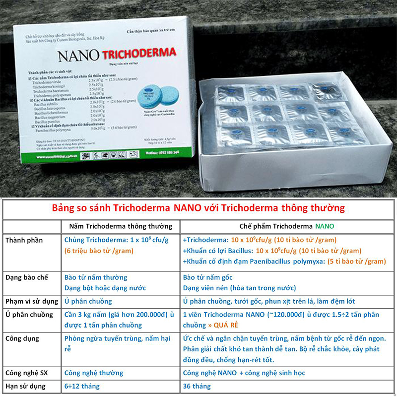 Hạn sử dụng lên tới 3 năm, được chiết xuất ở dạng viên nén, chứa bên trong gồm hàng tỷ chủng vi sinh vật gốc, nấm đối kháng Trichoderma và vi khuẩn có lợi Bacillus