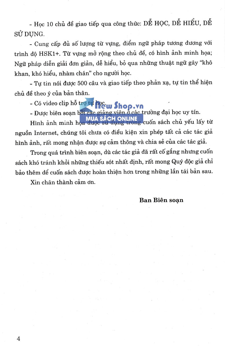 Cuốn sách 10 Ngày Tự Tin Giao Tiếp 500 Câu Đàm Thoại Tiếng Hoa (trình độ giao tiếp sơ cấp) gồm 10 chủ đề Giao tiếp cơ bản hằng ngày trong cuộc sống sinh hoạt đời thường như: Giới thiệu bản thân, chào hỏi, giới thiệu gia đình, bạn bè, diễn đạt thời gian, ăn uống, mua sắm, hỏi đườ