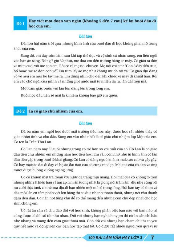 100 Bài Làm Văn Hay Lớp 3 Các em học sinh lớp 3 sẽ tìm thấy trong cuốn sách này cách hướng dẫn thực hiện một bài văn kể chuyện và Tập làm văn theo