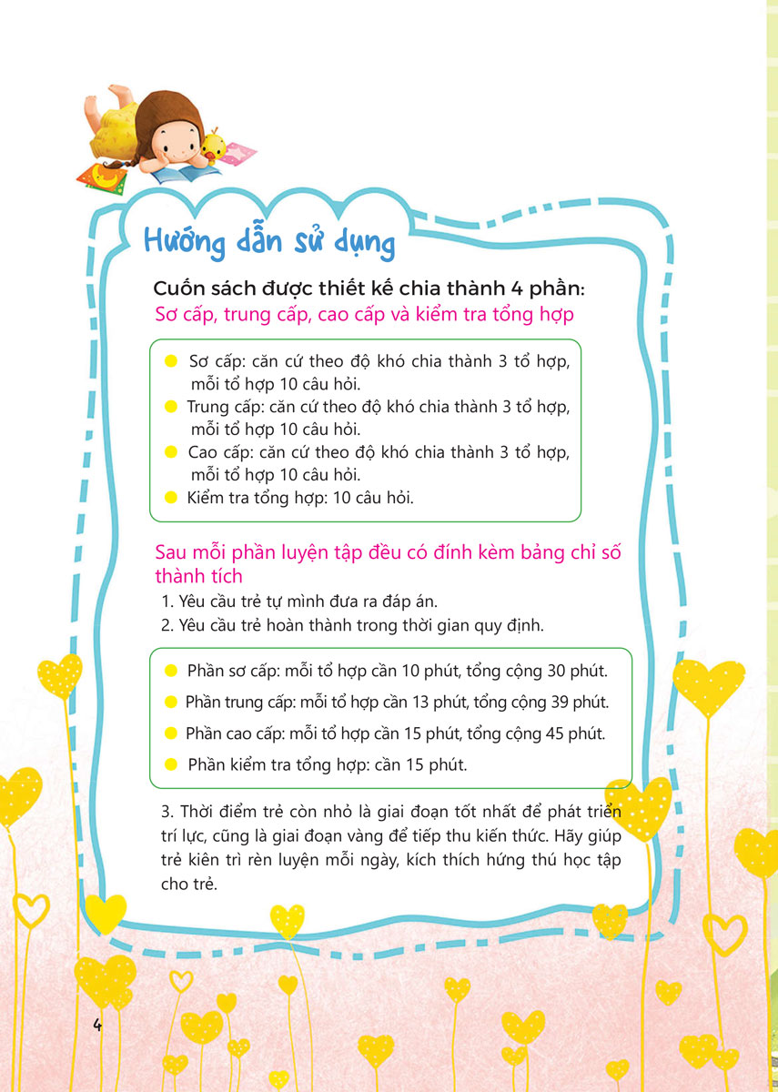 Cuốn sách bao gồm 100 câu hỏi rèn luyện quen thuộc mà hấp dẫn, theo trình tự từ dễ đến khó, bồi dưỡng năng lực tư duy, rèn luyện khả năng tập trung, mở rộng phạm vi kiến thức cho trẻ. Bao gồm: