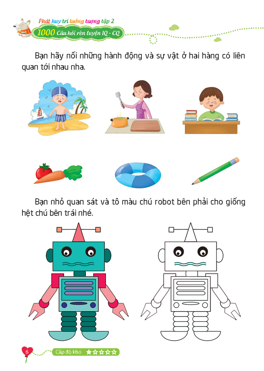 Mua tại Tiktok1000 Câu Hỏi Rèn Luyện IQ - CQ - Phát Huy Trí Tưởng Tượng - Tập 2 Những người thành công là những người luôn biết tạo ra sự khác biệt, sự đột phá có hiệu quả cả trong suy nghĩ và hành động. Sự hỗ trợ và hướng dẫn của cha mẹ đối với sự tò mò của trẻ, cũng như sự ủng hộ của họ đối với những thứ mà trẻ thích thú, thường là một chỉ số quan trọng cho sự thành công trong tương lai của con hơn bất kỳ điều gì khác. Rèn luyện trí não thông qua các trò chơi trí tuệ là biện pháp rất tốt giúp trẻ em rèn luyện IQ – CQ. Bộ sách “Sân chơi trí tuệ cho trẻ – 1000 Câu hỏi IQ – CQ” gồm 4 chủ đề với 4 kĩ năng khác nhau, mỗi chủ đề gồm 2 tập: