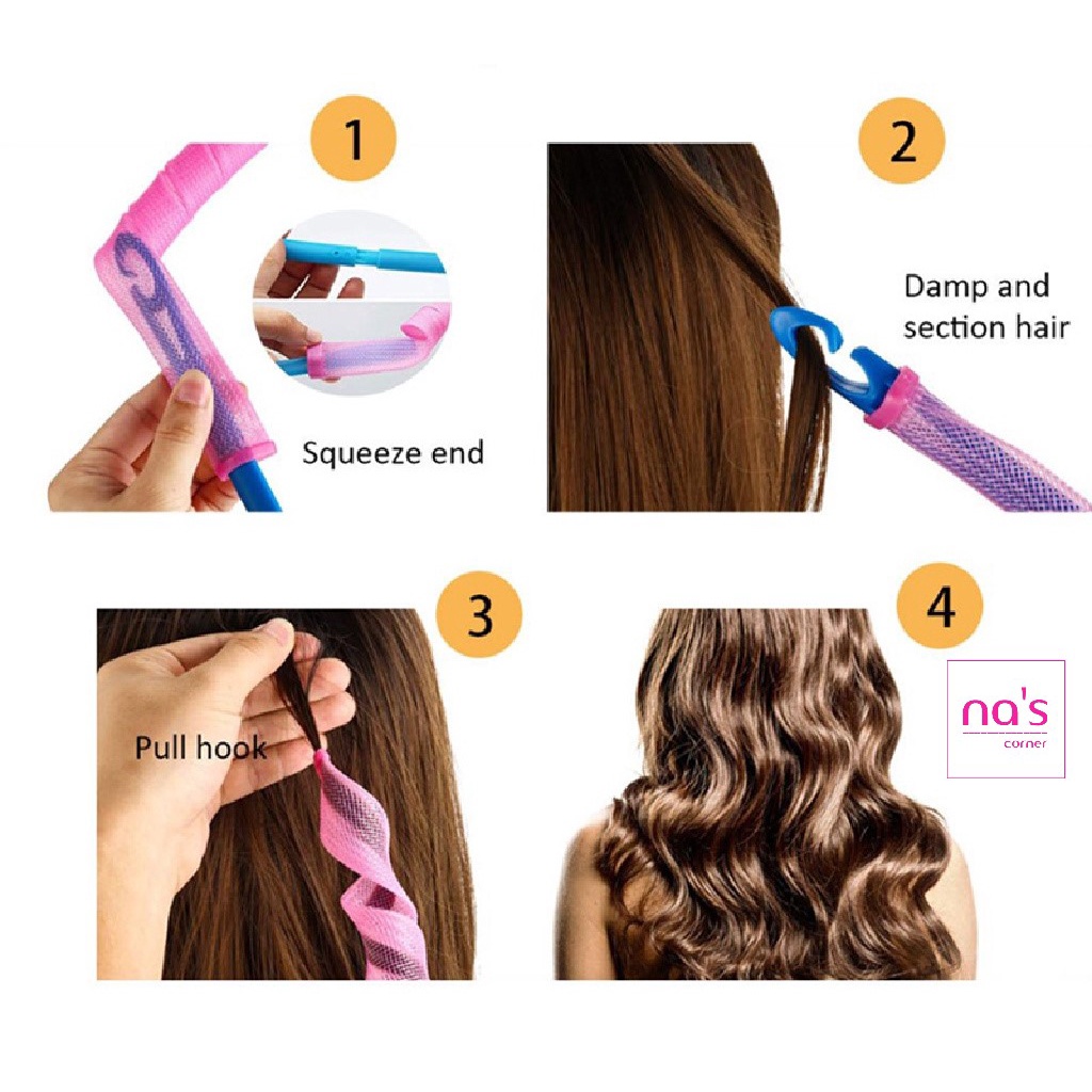B1: làm ướt tóc, có thể dùng kèm kem dưỡng tóc / xịt dưỡng tóc B2: dùng que rút rút tóc B3: đợi 3-4 tiếng B4: tháo lô cuốn ra Có thể dùng máy sấy sấy khô tóc trước khi rút sẽ cho độ xoăn chuẩn salon.