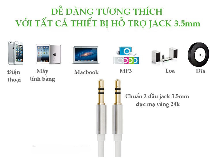 Mô tả sản phẩm Dây Audio 3.5mm tròn mạ vàng 24K, TPE cao cấp Giắc âm thanh dạng tròn chuẩn 2 đầu 3.5mm dùng để kết nối các thiết bị nghe nhạc như điện thoại,
