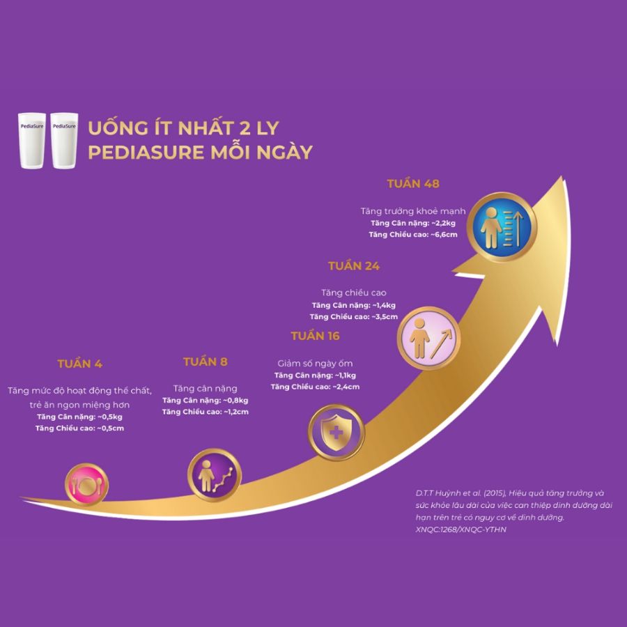 - Trẻ có nhu cầu năng lượng tăng cao. Hướng dẫn sử dụng Để bổ sung dinh dưỡng: 1 ly/ngày (trẻ 1-3 tuổi), 2ly/ngày (trẻ 4-10 tuổi) hoặc theo hướng dẫn của chuyên viên dinh dưỡng. Thay thế hoàn toàn bữa ăn qua ống thông cho trẻ ốm: theo hướng dẫn của Bác sĩ/chuyên viên dinh dưỡng. Tỷ lệ pha gợi ý Để có 225 ml PediaSure pha chuẩn, cho 190ml nước chín để nguội (≤37°C) vào ly. Vừa cho từ từ 5 muỗng gạt ngang bột PediaSure (muỗng có sẵn trong hộp, mỗi muỗng tương đương 9,8g) vừa khuấy cho tan đều. Lưu ý: Để tối ưu hiệu quả của những vi sinh vật có lợi (probiotics), nên pha PediaSure với nước đun sôi để nguội (≤37°C). Không được hâm nóng PediaSure đã pha bằng lò vi sóng vì có thể gây bỏng. Bảo quản