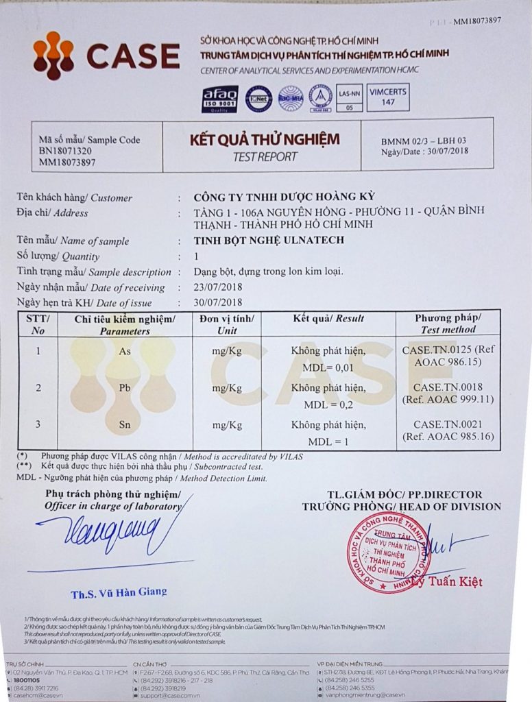 TINH NGHỆ ULNATECH Thành phần: - 100% tinh bột nghệ đỏ An Bình. - Nano Curcummin: 40.000mg/kg Hàm lượng Curcumin: 40.000mg/kg (gấp 4 lần tinh bột nghệ đỏ thông thường). Màu sắc: Vàng cam. Xuất