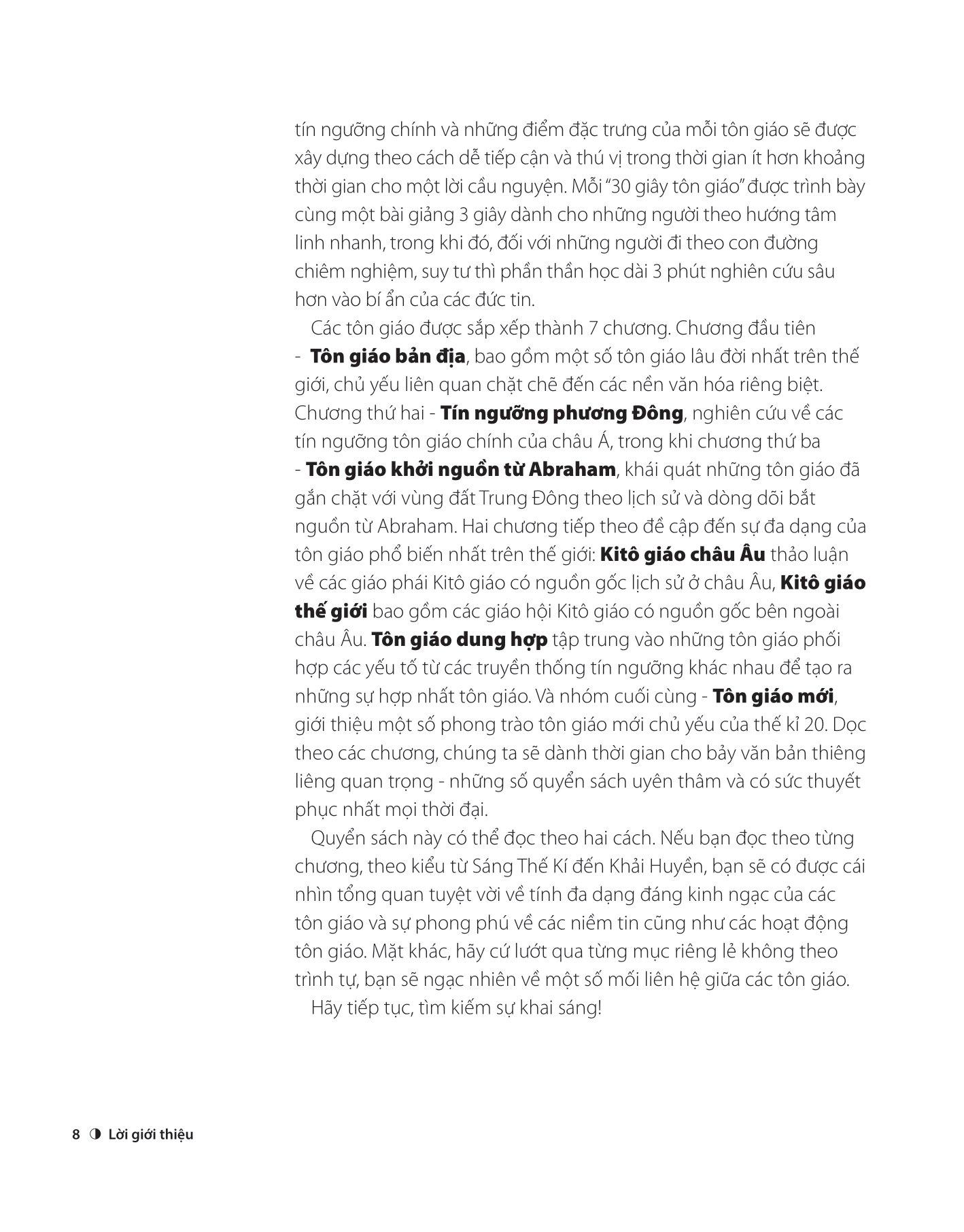 30 Giây Tôn Giáo làm sáng tỏ những niềm tin quan trọng của các tôn giáo, giáo phái lớn trên thế giới cũng như các tôn giáo ít phổ biến hơn và giải thích chúng chỉ trong nửa phút, hai trang giấy, 300 từ và một hình minh họa. Dù là bạn muốn hiểu những khác biệt chính giữa Giáo hội Luther và Thuyết Calvin hay tìm hiểu tổng quan về triết học Phật giáo, cuốn sách này là cách nhanh nhất để bạn bắt đầu hành trình và tìm thấy các tấm biển chỉ dẫn chính về các niềm tin đa dạng và cuốn hút nhất thế giới. Từ Thuyết Vật linh đến Hỏa giáo, bao gồm các mục về bảy tôn giáo chính, 30 Giây Tôn Giáo là bản hướng dẫn đáng tin cậy về 50 hệ thống niềm tin gợi tò mò nhất.