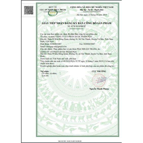 - Địa chỉ sản xuất: Công ty Cổ phần Dược phẩm PQA. Thửa 99, Khu Đồng Quàn, Xã Tân Thành, Huyện Vụ Bản, Tỉnh Nam Định. THÀNH PHẦN: