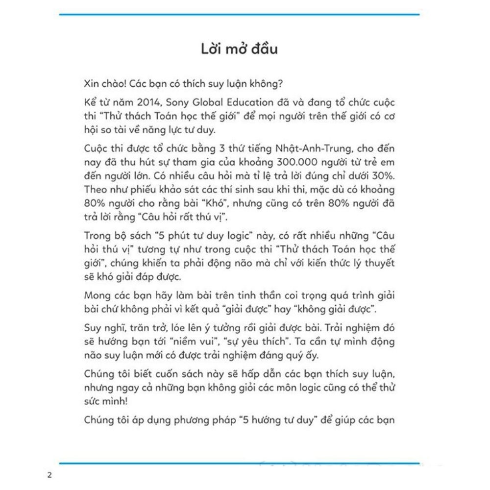 Đến từ Sony Global Education, tổ chức giáo dục hàng đầu Nhật Bản, 5 phút tư duy logic được biên soạn với khát vọng cung cấp cho bạn đọc những bài tập luyện rèn tư duy logic một cách bài bản và thú vị nhất. Bộ sách gồm 3 tập: Nhập môn – Cơ bản – Nâng cao. Mỗi tập sẽ giới thiệu các hướng tư duy khác nhau để giải quyết các vấn đề hóc búa, kèm theo các bài luyện tập với độ khó đa dạng, gợi ý từng bước, giúp trí óc bạn quen dần và thành thục việc suy nghĩ hiệu quả và chuẩn xác. Rất nhiều câu hỏi trong sách được lấy từ cuộc thi “Thử thách Toán học Thế giới”, cuộc thi nhằm tìm ra những bộ não sắc bén và thông minh nhất, nhưng chỉ đòi hỏi ở bạn 5 phút suy nghĩ mà thôi!