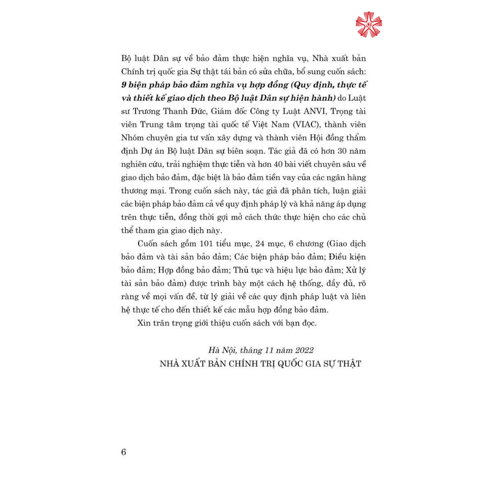Với mục đích cung cấp cho bạn đọc những thông tin cơ bản về các biện pháp bảo đảm theo quy định của Bộ luật Dân sự năm 2015, Nghị định số 21/2021/NĐ-CP ngày 19/3/2021 quy định thi hành Bộ luật Dân sự về bảo đảm thực hiện nghĩa vụ, Nhà xuất bản Chính trị quốc gia Sự thật tái bản có sửa chữa, bổ sung cuốn sách: 9 biện pháp bảo đảm nghĩa vụ hợp đồng (Quy định, thực tế và thiết kế giao dịch theo Bộ luật Dân sự hiện hành) do Luật sư Trương Thanh Đức, Giám đốc Công ty Luật ANVI, Trọng tài viên Trung tâm trọng tài quốc tế Việt Nam (VIAC), thành viên Nhóm chuyên gia tư vấn xây dựng và thành viên Hội đồng thẩm định Dự án Bộ luật Dân sự biên soạn. Tác giả đã có hơn 30 năm nghiên cứu, trải nghiệm thực tiễn và hơn 40 bài viết chuyên sâu về giao dịch bảo đảm, đặc biệt là bảo đảm tiền vay của các ngân hàng thương mại. Trong cuốn sách này, tác giả đã phân tích, luận giải các biện pháp bảo đảm cả về quy định pháp lý và khả năng áp dụng trên thực tiễn, đồng thời gợi mở cách thức thực hiện cho các chủ thể tham gia giao dịch này.