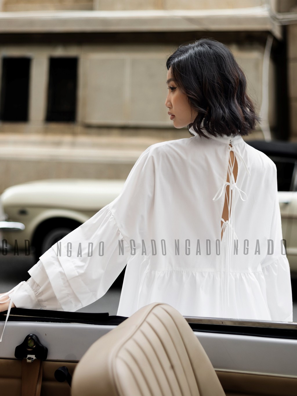 ✨Áo babydoll trắng NGADO , Áo kiểu nữ , Áo tay phồng cột nơ
