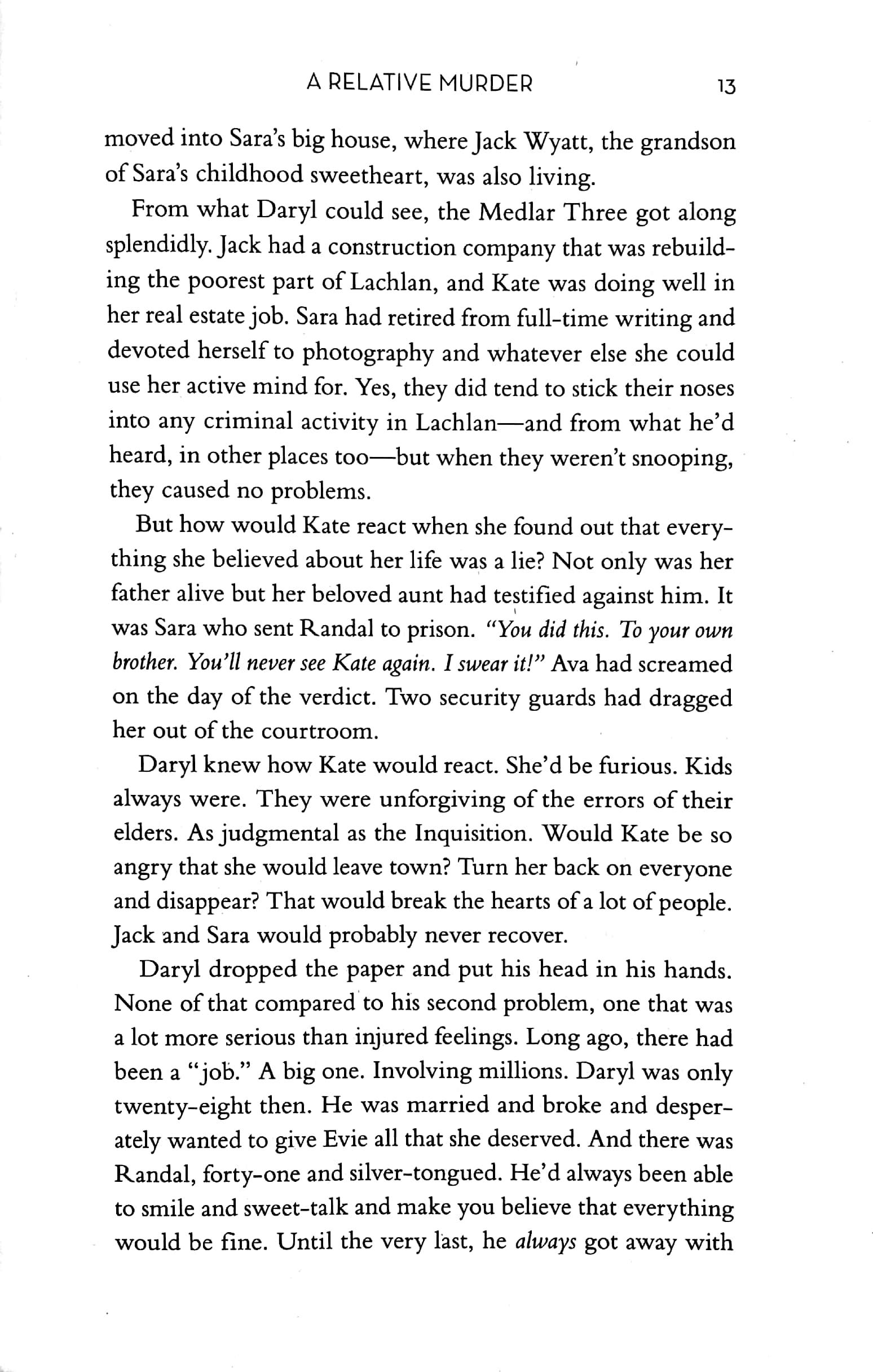 Bestselling novelist Sara Medlar is skilled at sharing stories about other people, but she hoped the truth about her own family would never surface. Her home in Lachlan, Florida, is her refuge and she loves having her niece Kate and dear friend Jack Wyatt together under her roof. The Medlar Three, as they are known around town, have sworn off getting involved in any more murder investigations.