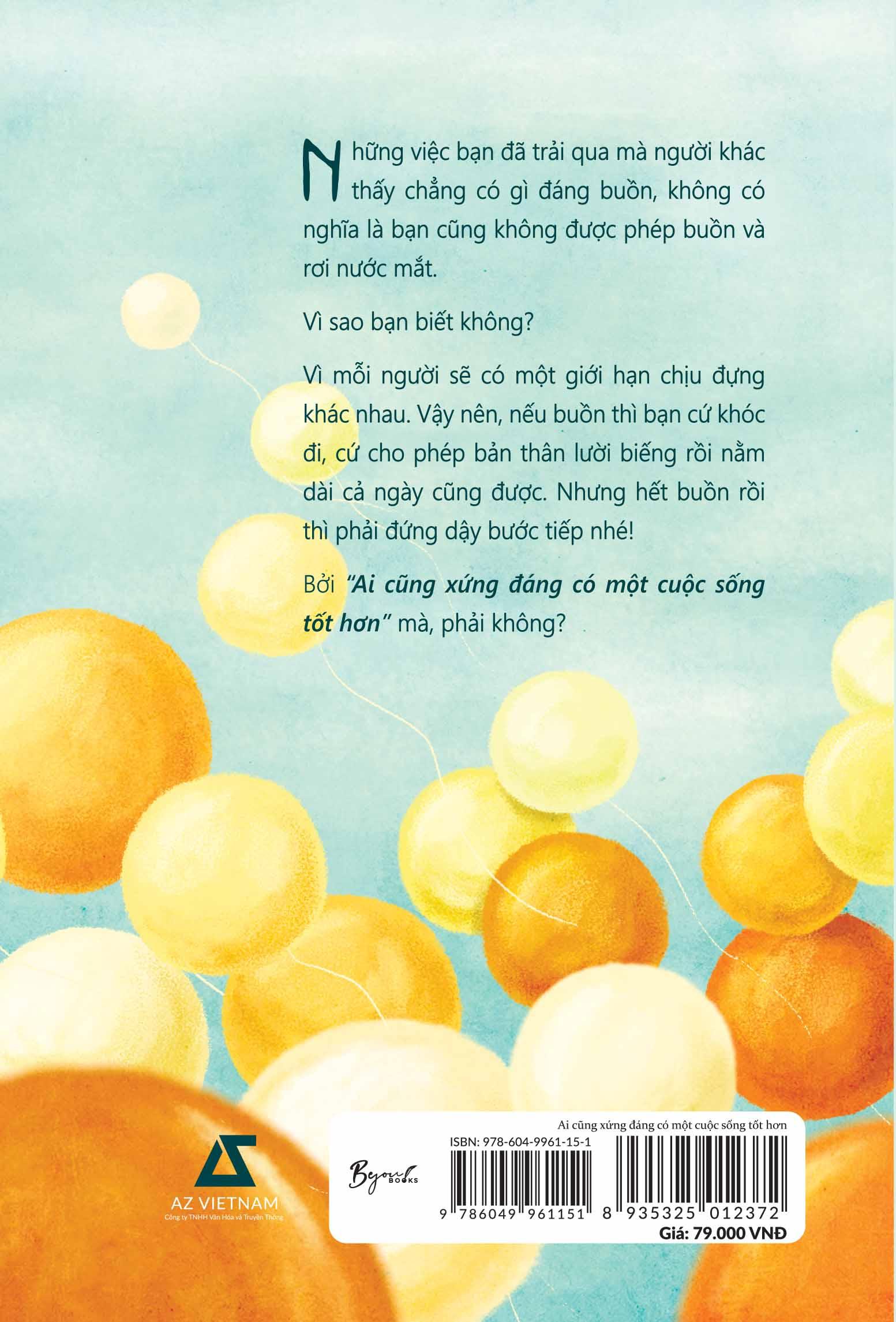 - Một món quà vỗ về những tâm hồn mệt mỏi trên hành trình theo đuổi ước mơ Trong tiếng Anh có một từ rất hay: “present” – vừa có nghĩa là “hiện tại”, vừa có nghĩa là “món quà”. Hiện tại chính là một món quà vô cùng đặc biệt mà vũ trụ trao tặng cho bạn. Nếu ngày hôm nay không cố gắng hết m.ình thì món quà bạn nhận được chỉ là phiên bản copy của quá khứ. Nhưng nếu nỗ lực vượt ra khỏi vùng an toàn, hôm nay có thể là nấc thang giúp bạn tiến gần hơn tới ước mơ. “Chúng ta không thiếu điều kiện để hiện thực hóa ước mơ, thứ duy nhất chúng ta thiếu chính là dũng khí để bắt đầu.” Điều tuyệt vời nhất mà tạo hóa ban cho con người chính là: mỗi khi mặt trời lên, chúng ta luôn có cơ hội để làm lại mọi thứ. Dù chúng ta còn trẻ hay đã già, dù ở trong hoàn cảnh nào đi chăng nữa, không bao giờ là quá muộn để theo đuổi ước mơ. Đây là điều mà tác giả t.hờ muốn gửi gắm tới bạn đọc thông qua cuốn sách “Ai cũng xứng đáng có một cuộc sống tốt hơn”. Bằng tất cả sự ấm áp và dịu dàng, cuốn sách nhỏ này sẽ khích lệ bạn dũng cảm tiến về phía trước, tự tạo nên phép màu cho cuộc đời m.ình. Không rực rỡ hay chói chang như nắng hè, phép màu ấy - tựa như ánh bình minh - nhẹ nhàng và chậm rãi khiến bạn tỏa sáng. Cho đến cuối cùng, tất cả chúng ta đều xứng đáng có một cuộc sống tốt hơn - nhờ bạn, do bạn và vì bạn.