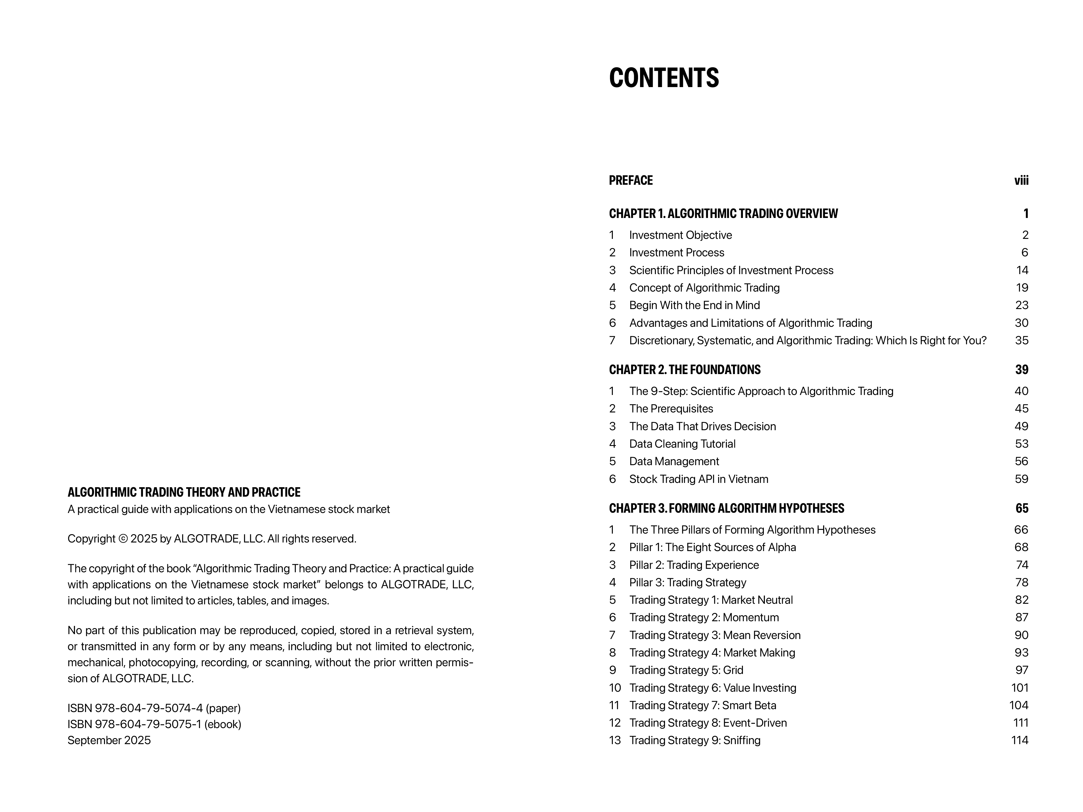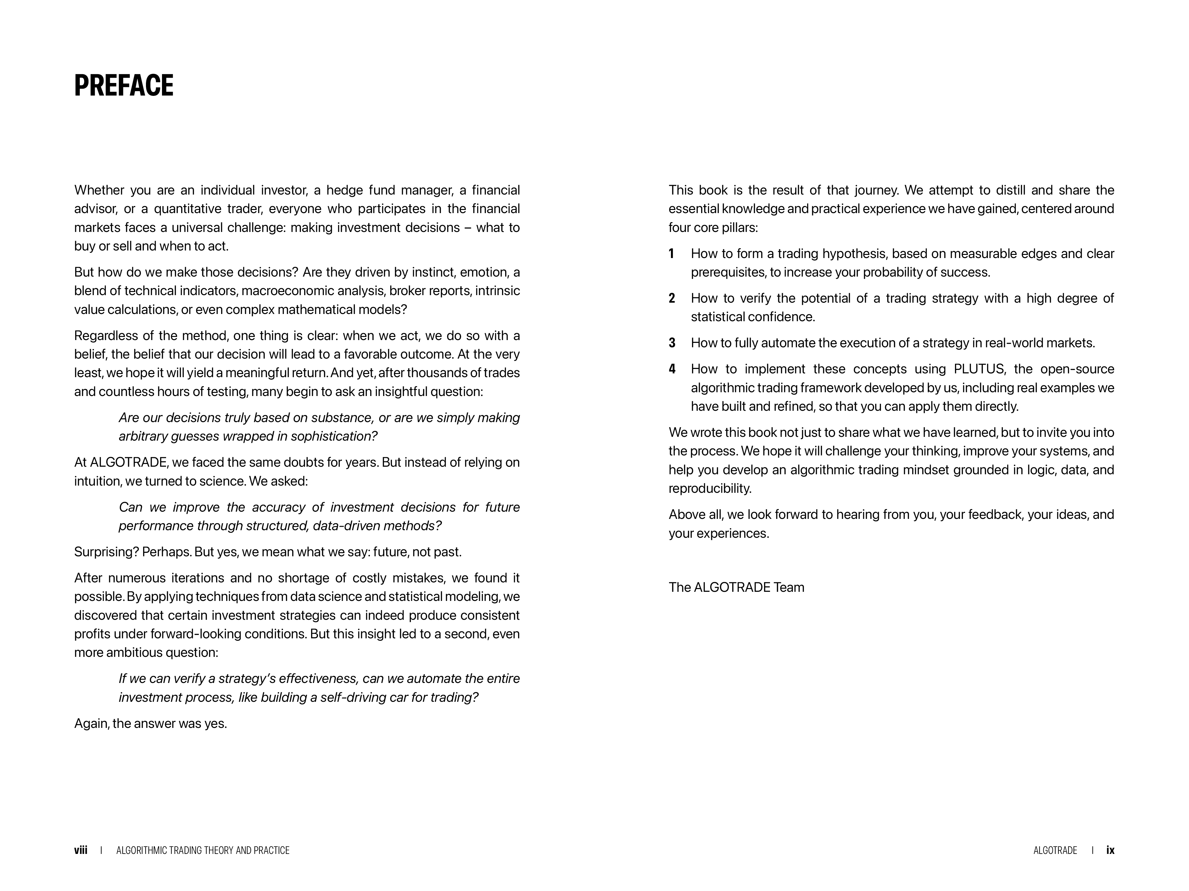 Whether you are an individual investor, a hedge fund manager, a financial advisor, or a quantitative trader, everyone who participates in the financial markets faces a universal challenge: making investment decisions - what to buy or sell and when to act. But how do we make those decisions? Are they driven by instinct, emotion, a blend of technical indicators, macroeconomic analysis, broker reports, intrinsic value calculations, or even complex mathematical models? Regardless of the method, one thing is clear: when we act, we do so with a belief, the belief that our decision will lead to a favorable outcome. At the very least, we hope it will yield a meaningful return. And yet, after thousands of trades and countless hours of testing, many begin to ask an insightful question: Are our decisions truly based on substance, or are we simply making arbitrary guesses wrapped in sophistication? At ALGOTRADE, we faced the same doubts for years. But instead of relying on intuition, we turned to science. We asked: Can we improve the accuracy of investment decisions for future performance through structured, data-driven methods? Surprising? Perhaps. But yes, we mean what we say: future, not past. After numerous iterations and no shortage of costly mistakes, we found it possible. By applying techniques from data science and statistical modeling, we discovered that certain investment strategies can indeed produce consistent profits under forward-looking conditions. But this insight led to a second, even more ambitious question: If we can verify a strategy's effectiveness, can we automate the entire investment process, like building a self-driving car for trading? Again, the answer was yes. This book is the result of that journey. We attempt to distill and share the essential knowledge and practical experience we have gained, centered around four core pillars: 1 How to form a trading hypothesis, based on measurable edges and clear prerequisites, to increase your probability of success. 2 How to verify the potential of a trading strategy with a high degree of statistical confidence. 3 How to fully automate the execution of a strategy in real-world markets. 4 How to implement these concepts using PLUTUS, the open-source algorithmic trading framework developed by us, including real examples we have built and refined, so that you can apply them directly. We wrote this book not just to share what we have learned, but to invite you into the process. We hope it will challenge your thinking, improve your systems, and help you develop an algorithmic trading mindset grounded in logic, data, and reproducibility. Above all, we look forward to hearing from you, your feedback, your ideas, and your experiences. The ALGOTRADE Team