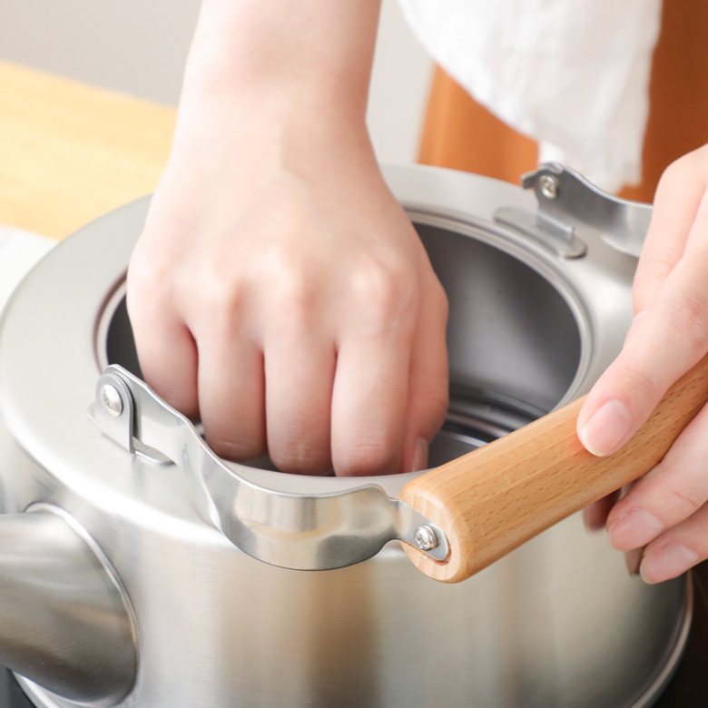 - Tay xách/ Quai ấm được làm bằng gỗ tự nhiên cách nhiệt tối ưu cùng màu sắc sang trọng