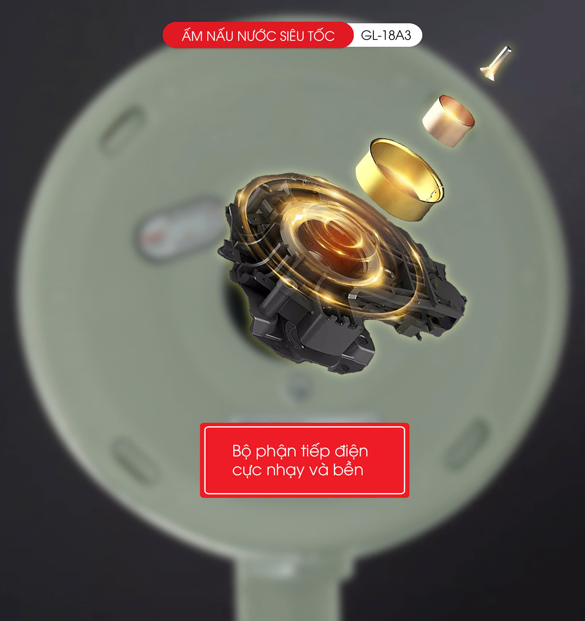 - Thiết kế tinh tế - An toàn tuyệt đối Ấm siêu tốc Gali GL-18A3 nổi bật với thiết kế 2 lớp chống nóng an toàn. Vỏ ngoài bằng nhựa nguyên sinh cao cấp, bên trong là lớp Inox 304 chống gỉ set, bảo đảm an toàn cho sức khỏe người dùng.