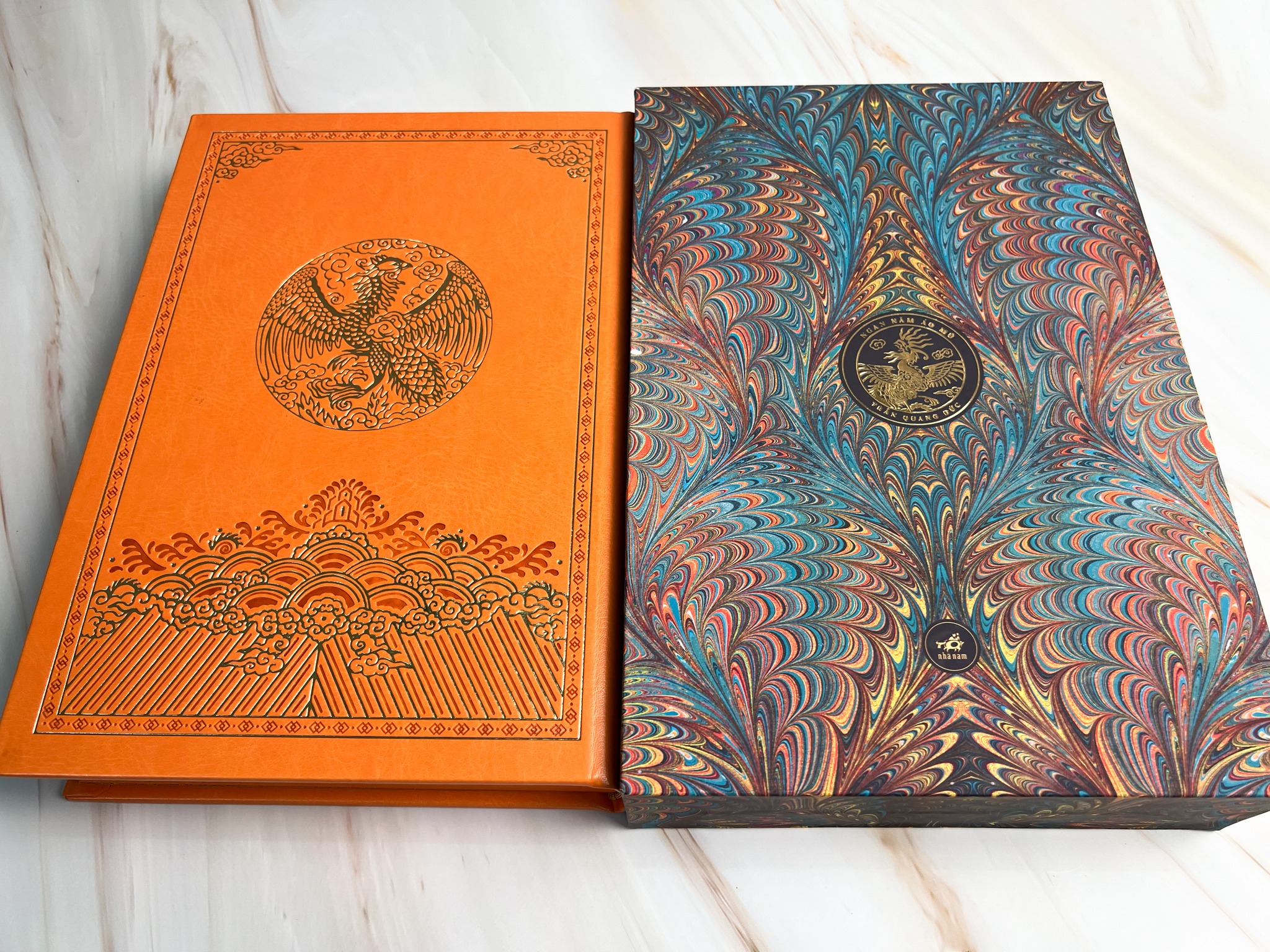 - Gáy sách gồm tên sách, tên tác giả, minh họa phượng hoàng, hoa văn thủy ba, logo Nhã Nam ép nhũ vàng tây, lồng ghép với các họa tiết mây dập chìm.