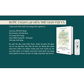 Chen vai thích cánh để có một chỗ bám trên xe buýt giờ đi làm, nhích từng xentimét bánh xe trên đường lúc tan sở, quay cuồng với thi cử và tiến độ công việc, lu bù vướng mắc trong những mối quan hệ cả thân lẫn sơ… bạn có luôn cảm thấy thế gian xung quanh mình đang xoay chuyển quá vội vàng?   Nếu có, hãy tạm dừng một bước   Để tự hỏi, là do thế gian này vội vàng hay do chính tâm trí bạn đang quá bận rộn? Để cầm cuốn sách nhỏ dung dị mà lắng đọng này lên, chậm rãi lật giở từng trang, thong thả khám phá những điều mà chỉ khi bước chậm lại mới có thể thấu rõ: về các mối quan hệ, về chính bản thân mình, về những trăn trở trước cuộc đời và nhân thế, về bao điều lý trí rất hiểu nhưng trái tim chưa cách nào nghe theo…   Ra mắt lần đầu năm 2012, Bước chậm lại giữa thế gian vội vã của Đại đức Hae Min đã liên tục đứng đầu danh sách best-seller của nhiều trang sách trực tuyến uy tín của Hàn Quốc, trở thành cuốn sách chữa lành cho hàng triệu người trẻ luôn tất bật với nhịp sống hiện đại hối hả.