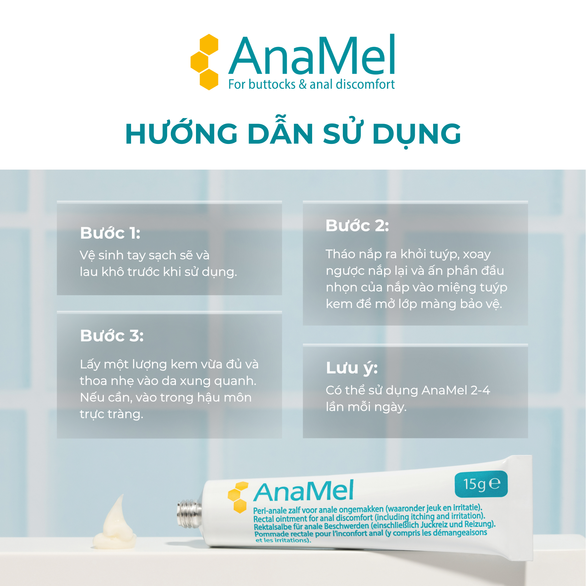 - Thích hợp để sử dụng lâu dài THÀNH PHẦN SẢN PHẨM AnaMel là kem làm dịu da, có thành phần chính là mật ong nguyên chất (revamil honey). CÁC ỨNG DỤNG CỦA SẢN PHẨM AnaMel được dùng cho các vết thương nông và khó chịu ở vùng hậu môn trực tràng: