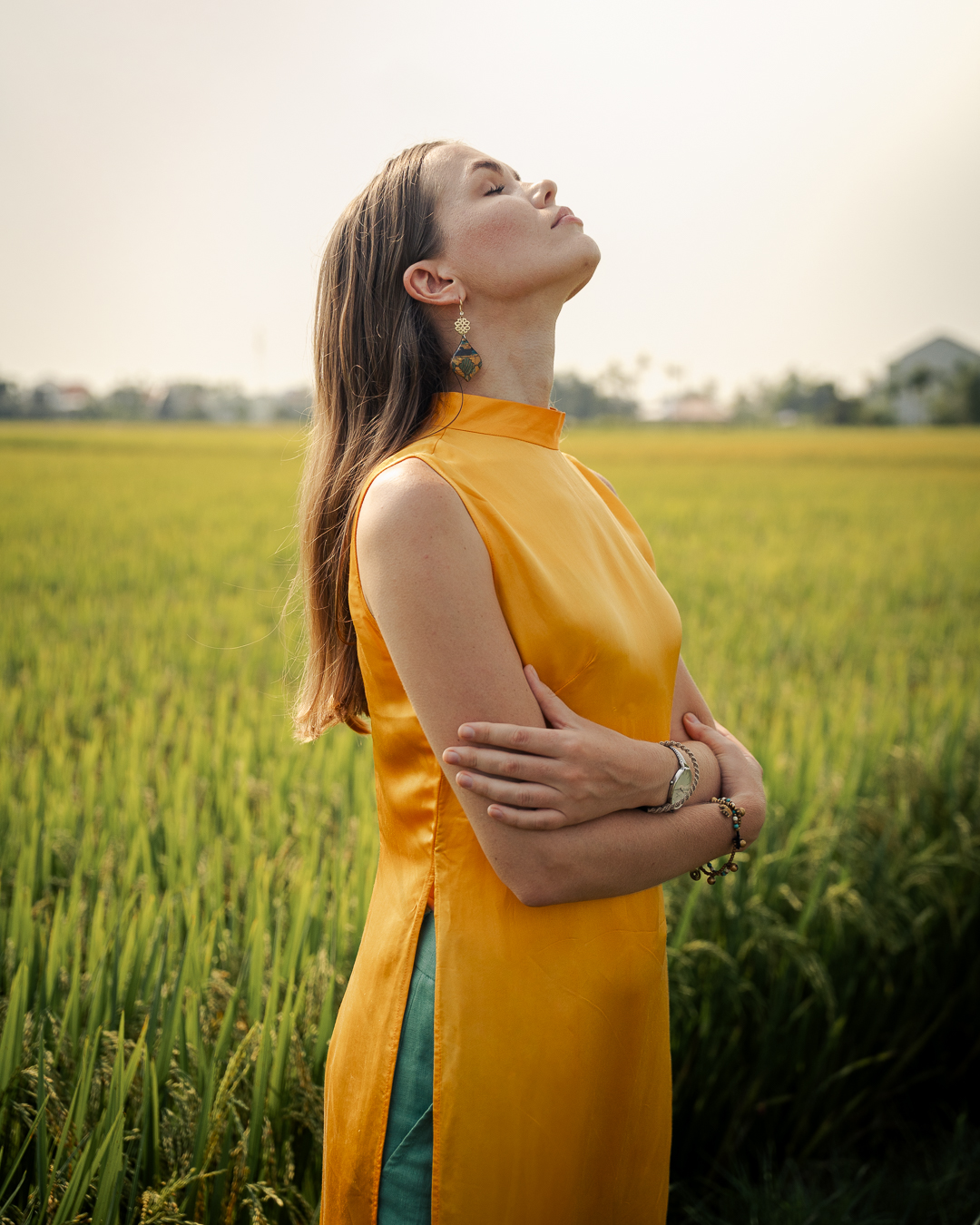 Mua tại TiktokTấm áo dài cách tân mang sắc màu óng ả nắng vàng lấy cảm hứng từ sắc hoa mùa thu nhiệt đới dã quỳ – loài hoa nổi bật với sắc vàng rực rỡ, phủ kín các sườn đồi cao nguyên. Với tinh thần luôn hướng về cảm xúc giao thoa giữa truyền thống và hiện đại, tấm áo dài Dã Quỳ được Hity thiết kế theo phong cách tối giản, không quá cầu kỳ nhưng vẫn giữ được vẻ đẹp tinh tế, tôn lên sự duyên dáng của người phụ nữ. Màu vàng nổi bật từ hoa dã quỳ tạo nên vẻ đẹp tự nhiên, tươi mới, mang đậm dấu ấn của mùa thu vùng nhiệt đới. Những chi tiết nhỏ như đường viền cổ áo, những đường cắt may khéo léo tạo nên nét chấm phá riêng, vừa giữ được vẻ cổ điển của áo dài truyền thống vừa thêm nét trẻ trung hiện đại. Chất liệu lụa tơ tằm được dệt từ làng lụa đũi Nam Cao, Thái Bình mềm mại, nhẹ nhàng và mát mẻ, giúp người mặc cảm nhận từng hơi thở đất trời thật nhẹ nhàng thanh cao. Áo dài kiểu dáng suông cách tân không tay Cổ cao 3.5cm Chích ben ngực và ben lưng Cài bằng dây khoá kéo sau lưng CHẤT LIỆU Lụa tơ tằm 100%, sợi tơ tằm tự nhiên Việt Nam Sản phẩm vải của HTX Làng nghề Lụa đũi Nam Cao Thái Bình với 100% từ tơ tằm tự nhiên đạt những tiêu chuẩn cao Dệt máy Khổ vải: 90cm Nghệ nhân: Ninh Trung Cắt may thủ công tinh tế tại Hity Atelier Nha Trang, Việt Nam Hướng dẫn sử dụng: Tránh ánh nắng mặt trời: Không phơi lụa tơ tằm dưới ánh nắng trực tiếp vì có thể làm vải bị phai màu và giảm độ bền của sợi. Giữ khô ráo: Không để lụa tiếp xúc lâu với nước hay các chất lỏng có thể gây ra các vết bẩn khó giặt. Không dùng nước hoa hay xịt khử mùi trực tiếp: Các chất hóa học trong nước hoa hay xịt khử mùi có thể làm hỏng sợi lụa và tạo vết ố. Cách giặt: Giặt bằng tay hoặc giặt hấp. Đổ đầy nước lạnh 24 - 35 độ C vào chậu hoặc bồn rửa. Thêm 5ml dầu gội hoặc xà bông dịu nhẹ, không chất tẩy vào chậu hoặc bồn rửa, khuấy đều cho nước lên bọt. Nhúng ngập đồ lụa vào bồn rửa, khuấy nhẹ để đồ lụa ngấm nước từ từ. bạn có thể ngâm đồ lụa từ 3-4 phút, sau đó vò nhẹ bằng tay. Xả 3 đến 4 lần nước lạnh làm sạch, sau đó nhấc đồ tơ tằm ra và giũ nước. Không vắt sẽ làm đồ lụa bị nhăn. Không vò hay vắt mạnh: Khi giặt, nhẹ nhàng bóp nhẹ để làm sạch và xả lại bằng nước sạch. Không vò hay vắt mạnh vì có thể làm hỏng cấu trúc của sợi. Không sử dụng nước tẩy / thuốc tẩy Sử dụng dấm hoặc chanh: Khi xả, có thể thêm một chút dấm hoặc nước chanh vào nước xả cuối để giữ cho lụa mềm mại và sáng bóng. Chỉ giặt riêng từng sản phẩm để tránh các sản phẩm loang màu sang nhau. Cách làm khô Phơi khô trên bề mặt phẳng, nơi thoáng gió, dưới bóng râm, tránh phơi trực tiêp dưới ánh nắng sẽ làm lụa khô, yếu sợi và phai màu. Không sử dụng máy sấy có thể làm co và làm hỏng cấu trúc của lụa. Cách ủi (là) Ủi ở nhiệt độ tối đa 110ºC (Chế độ Lụa Silk) Ủi bằng bàn ủi hơi nước Ủi mặt trái: Đặt một lớp vải mỏng lên trên lụa và là từ mặt trái để tránh làm bóng vải Lụa nên khô hoàn toàn trước khi ủi để tránh hiện tượng co rút. Bảo quản