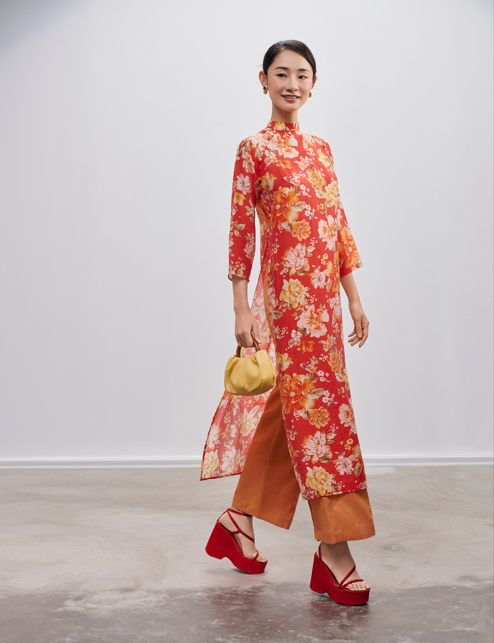 Dáng áo suông nhẹ, không quá ôm sát, vừa đủ để gợi lên những đường cong ý nhị, lại vừa mang đến sự tự do, phóng khoáng. Khi kết hợp cùng quần lụa ống rộng đồng điệu về sắc cam đất, tổng thể bộ trang phục trở nên hài hòa, thời thượng, phá vỡ những quy tắc cũ kỹ để kiến tạo một định nghĩa mới về vẻ đẹp áo dài: thanh lịch, hiện đại nhưng vẫn đậm đà bản sắc.