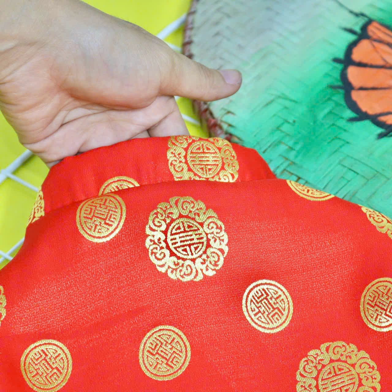 - Thiết kế : Áo Tết gấm thái cao cấp, mát, bền, đẹp, dễ thương. In hình đồng tiền dễ thương . Công nghệ in sắc nét, bền và đẹp, tha hồ giặt
