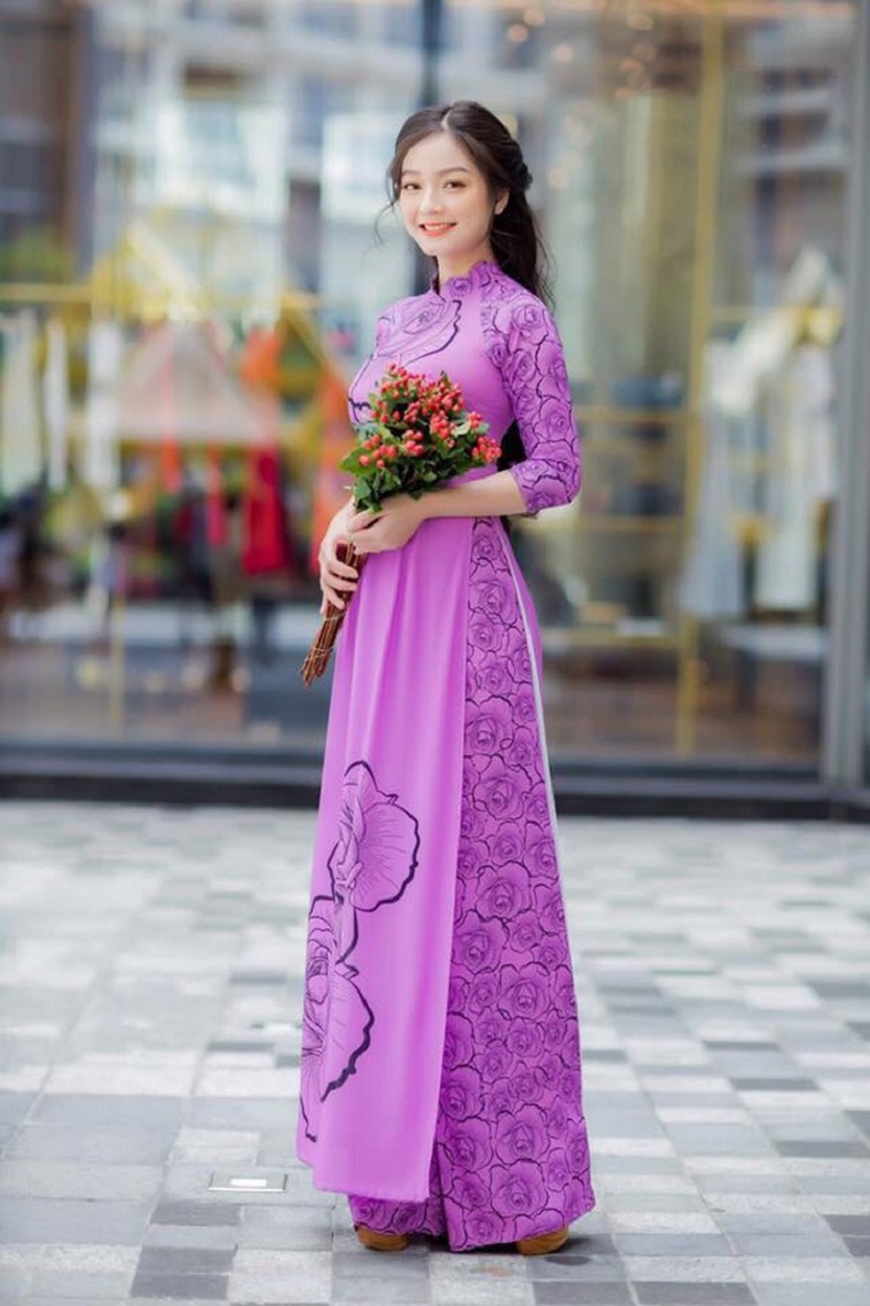 Chất liệu: Vải lụa ý chính phẩm hoạ tiết 6D Màu sắc: có 2 màu Hồng + Tím Đủ size: M-L-XL-XXL-XXXL Phù hợp: từ 44kg - 75kg Kiểu dáng: Set áo dài, bao gồm: Áo