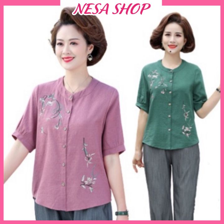 Áo sơ mi nữ trung niên cao cấp cổ tròn tay lỡ tặng mẹ chất liệu Linen thun form rộng bigsize NeSa Shop