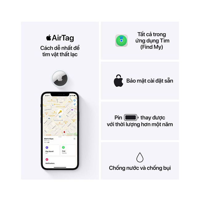 - Hãy chọn cho mình những chiếc AirTag thật phù hợp với dàn phụ kiện đầy màu sắc đa dạng Pháp lý Tính năng Tìm Chính Xác tương thích với iPhone 11, iPhone 11 Pro, iPhone 11 Pro Max, iPhone 12, iPhone 12 mini, iPhone 12 Pro và iPhone 12 Pro Max. Thử nghiệm được Apple thực hiện trong tháng 3 năm 2021 sử dụng các thiết bị và phần mềm tiền sản xuất của AirTag kết nối với iPhone 11, iPhone 11 Pro, iPhone 11 Pro Max, iPhone 12 mini, iPhone 12, iPhone 12 Pro, và iPhone 12 Pro Max chạy phần mềm tiền sản xuất. Thời lượng pin dựa trên cơ sở sử dụng thiết bị hàng ngày với tình huống bốn lần phát âm thanh và mỗi ngày Tìm Chính Xác một lần. Thời lượng pin khác nhau tùy thuộc vào cách sử dụng, điều kiện môi trường, nhà sản xuất pin thay thế và nhiều yếu tố khác; các kết quả thực tế sẽ khác nhau. AirTag có khả năng chống tia nước, chống nước và chống bụi. Sản phẩm đã qua kiểm nghiệm trong điều kiện phòng thí nghiệm có kiểm soát đạt mức IP67 theo tiêu chuẩn IEC 60529 (chống nước ở độ sâu tối đa 1 mét trong vòng tối đa 30 phút). Khả năng chống tia nước, chống nước và chống bụi không phải là các điều kiện vĩnh viễn, và khả năng này có thể giảm do hao mòn thông thường. Tham khảo tài liệu An Toàn và Hướng Dẫn Xử Lý để biết cách lau sạch và làm khô thiết bị.