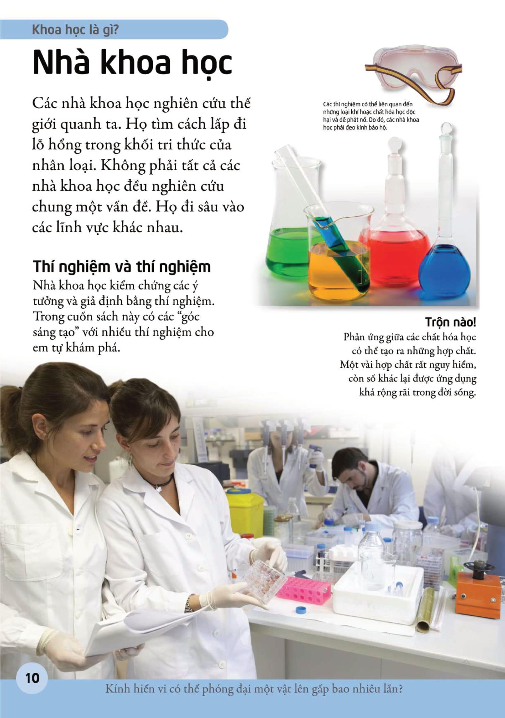 Với các hình minh họa trực quan sinh động, bắt mắt, cuốn sách cung cấp một lượng kiến thức phong phú, súc tích, dễ hiểu, cùng những câu hỏi vui, mẩu thông tin thú vị về khoa học. Em sẽ được tìm hiểu từng lĩnh vực mà khoa học nghiên cứu, từ sinh vật học, hóa học, vật lí tới thiên văn học. Bên cạnh đó, em có thể tìm trong cuốn sách các hướng dẫn và gợi ý giúp em thử làm nhà khoa học nhí nữa đấy.
