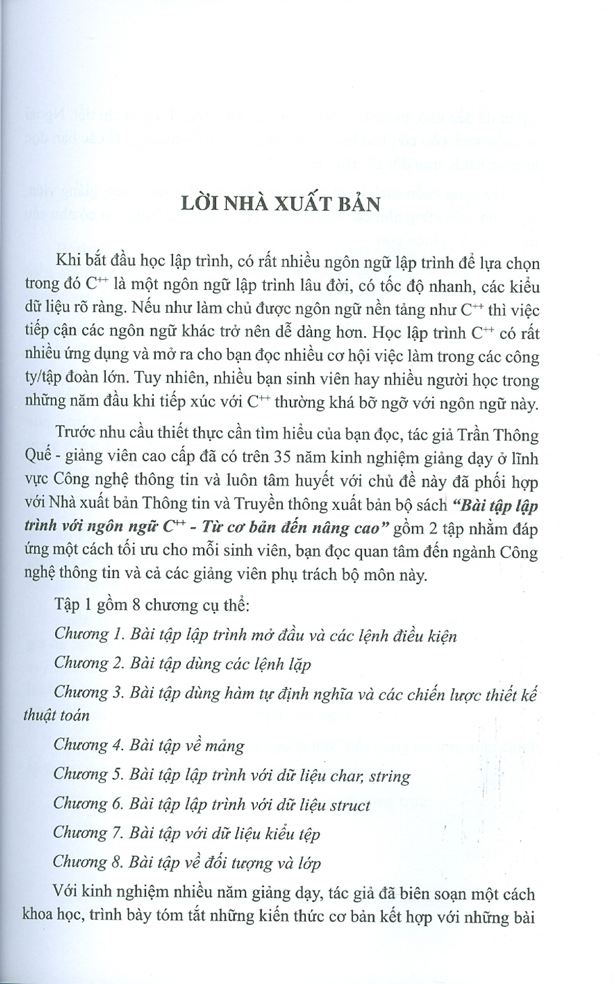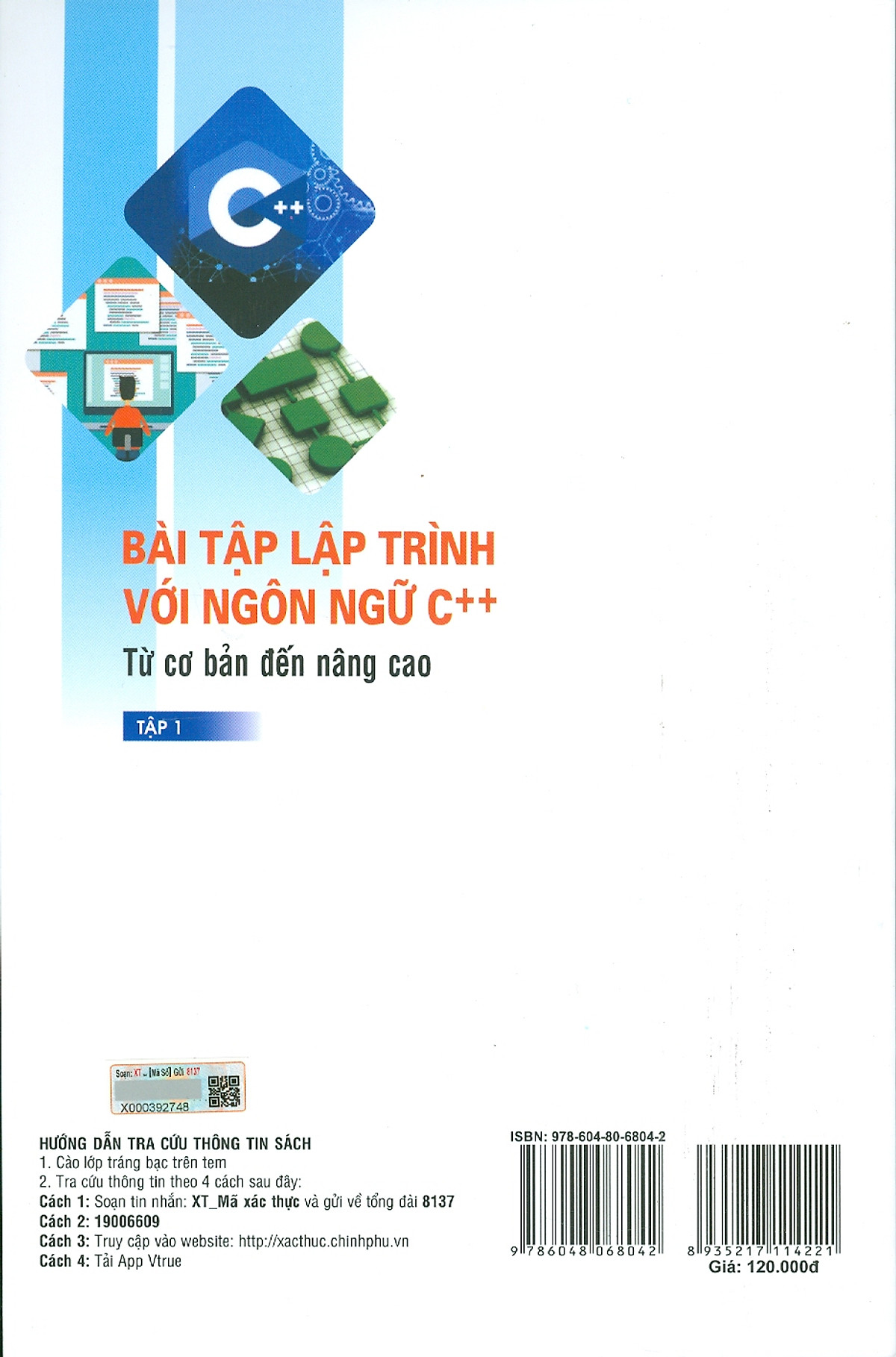 Khi bắt đầu học lập trình, có rất nhiều ngôn ngữ lập trình để lựa chọn trong đó C++ là một ngôn ngữ lập trình lâu đời, có tốc độ nhanh, các kiểu dữ liệu rõ ràng. Nếu như làm chủ được ngôn ngữ nền tảng như C++ thì việc tiếp cận các ngôn ngữ khác trở nên dế dagnf hơn. Học lập trình C++ có rất nhiều ứng dụng và mở ra cho bạn đọc nhiều cơ hội việc làm trong các công ty/ tập đoàn lớn. Tuy nhiên, nhiều bạn sinh viên hay nhiều người học trong những năm đầu khi tiếp xúc với C++ thường khá bỡ ngỡ với ngôn ngữ này. "Bài tập lập trình với ngôn ngữ C++ từ cơ bản đến nâng cao" gồm 2 tập, đáp ứng một cách tối ưu cho mỗi sinh viên, bạn đọc quan tâm đến ngành Công nghệ thông tin và cả các giảng viên phụ trách bộ môn này. Tập 1 gồm 8 chương cụ thể: Chương 1: Bài tập lập trình mở đầu và các lệnh điều kiện Chương 2: Bài tập dùng các lệnh lặp Chương 3: Bài tập dùng hàm tự định nghĩa và các chiến lược thiết kế thuật toán Chương 4: Bài tập về mảng Chương 5: Bài tập lập trình với dữ liệu char, string Chương 6: Bài tập lập trình với dữ liệu struct Chương 7: Bài tập với dữ liệu kiểu tệp Chương 8: Bài tập về đối tượng và lớp Tập 2 gồm 6 chương Chương 1 - Bài tập về cấu trúc dữ liệu kiểu trừu tượng Chương 2 - Bài tập về sắp xếp ngoài Chương 3 - Bài tập về bảng băm Chương 4 - Bài tập về cấu trúc cây Chương 5 - Bài tập về lý thuyết đồ thị Chương 6 - Bài tập về đồ họa Với kinh nghiệm nhiều năm giảng dạy, tác giả đã biên soạn một cách khoa học, trình bày tóm tắt những kiến thức cơ bản kết hợp với những bài tập từ dễ đến khó, từ cơ bản đến nâng cao kèm theo lời giải chi tiết. Ngoài ra cuốn sách còn có phần bài tập tự luyện sau mỗi chương để các bạn đọc tự thực hành, trau dồi kỹ năng lập tình. Hy vọng cuốn sách là tài liệu hự ích dành cho sinh viên, giảng viên, lập trình viên cũng như các chuyên gia về công nghệ thông tin có nhu cầu tìm hiểu và nghiên cứu.