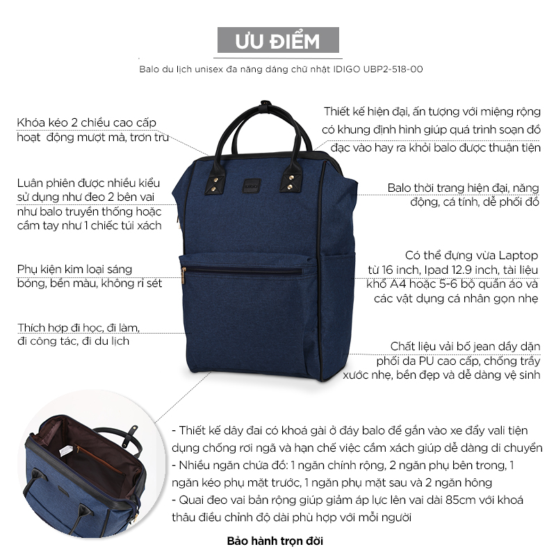Balo được thiết kế với kiểu dáng du lịch cá tính, trẻ trung, rộng rãi, tiện dụng dành riêng cho các tín đồ du lịch yêu thích phong cách năng động, độc đáo nhưng không kém phần cá tính. Sản phẩm phù hợp cho mọi độ tuổi, có thể kết hợp với nhiều loại trang phục khác nhau để đem lại sự đa dạng về phong cách, phù hợp để đi học, đi làm, đi du lịch hoặc đi công tác cùng bạn bè, đồng nghiệp hay người thân…Trọng lượng của balo 900 gram.
