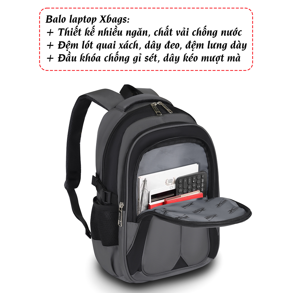 balo nam đựng laptop XBags này có 2 ngăn chính và nhiều ngăn phụ, balo nam đựng laptop này có nhiều ngăn, túi nhỏ khác nhau rất tiện dụng để các vật dụng khác như sách vở, dụng cụ học tập....