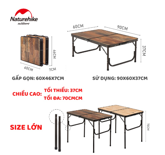 BÀN CẮM TRẠI MDF VINTAGE 2 MỨC CHIỀU CAO NATUREHIKE NH20JJ028 * THÔNG TIN SẢN PHẨM: - Thương hiệu: NatureHike - Dòng sản phẩm: Glamping - Mã sản phẩm: NH20JJ028 - Chất liệu: Hợp kim nhôm / Ván MDF (Độ dày 4mm) - Kích thước & Trọng lượng: +Bàn nhỏ: Kích thước sử dụng 53x40x23cm, Kích thước gấp gọn 26.5x40x7cm; Trọng lượng 1.5kg + Bàn to: Kích thước sử dụng 90x60x37cm; Kích thước gấp gọn 46x60x7cm; Trọng lượng 3,6kg - Tải trọng: 25kg - Màu sắc: Nâu, Gỗ tự nhiên - Xuất xứ: Trung Quốc