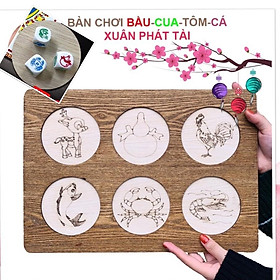 BÀN CHƠI BẦU CUA TÔM CÁ BẰNG GỖ Cách chơi đơn giản: Có 6 linh vật lần lượt là: BẦU-CUA -TÔM-CÁ-CUA-GÀ chọn ra một người làm nhà quản lý và đổ xí ngầu,người chơi sẽ