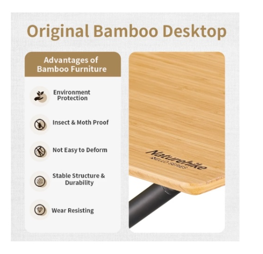 Thông tin sản phẩm: - Thương hiệu: NatureHike - Mã sản phẩm: NH22JU012 - Chất liệu: - Mặt bàn: Gỗ tre - Khung bàn: hợp kim nhôm - Túi vải: Vải Oxford 630D - Kích thước sử dụng: 785843cm - Kích thước gấp gọn: 78586cm - Trọng lượng: 6,8kg - Tải trọng: 30kg - Màu sắc: Màu gỗ tự nhiên - Xuất xứ: Trung Quốc