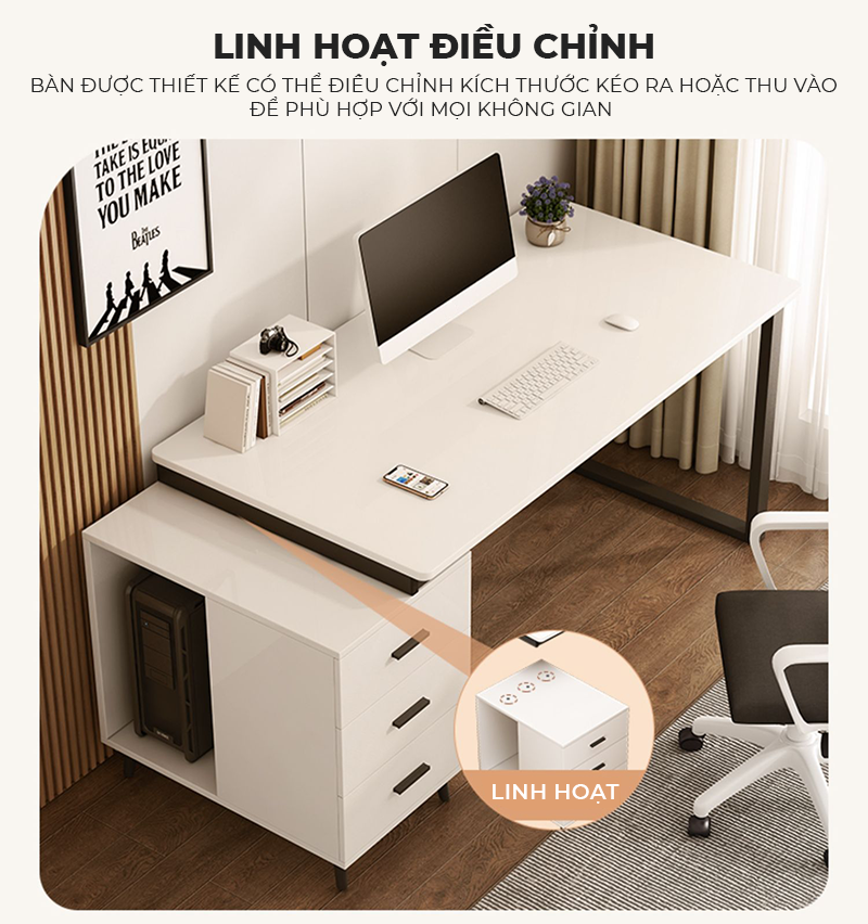 Công năng: Là mẫu bàn làm việc có thiết kế hiện đại kèm tủ hồ sơ đa năng phù hợp tại nhà và cả văn phòng làm việc
