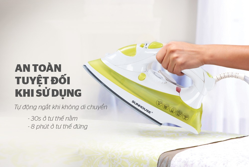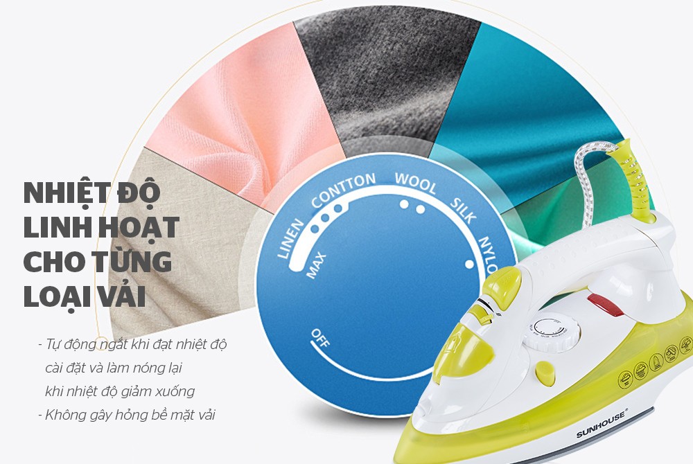 - Cảm biến nhiệt đóng ngắt an toàn An tâm hoàn toàn khi sử dụng bàn là hơi SUNHOUSE vì được trang bị cảm biến nhiệt an toàn, tự động đóng ngắt khi quá tải nhiệt. Bàn là sẽ tự ngắt khi đạt đến nhiệt độ lý tưởng (phù hợp với các loại vải khác nhau).