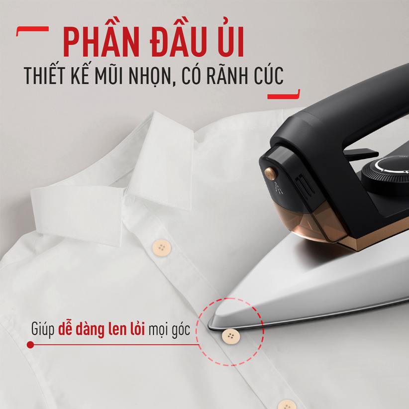 - Đầu bàn ủi khô nhọn kèm rãnh cúc giúp ủi dễ dàng những vị trí khó ủi như: hàng cúc, cổ tay, cổ áo,...