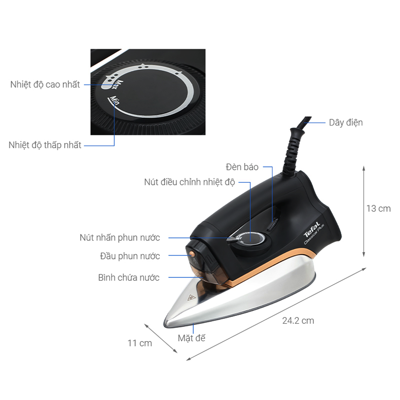- Chất liệu: Đế bằng hợp kim siêu bền tráng men titanium chống dính tốt. Điện trở đúc giúp nóng nhanh mà nguội nhanh. - Mức nhiệt: Chỉnh nhiệt độ theo từng loại vải như: