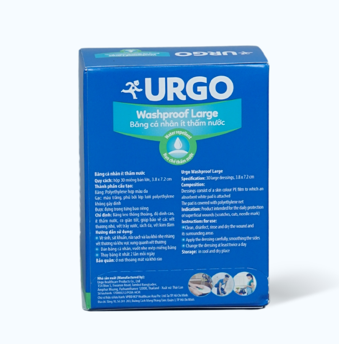 ✨Băng cá nhân ít thấm nước URGO Washproof Large bảo vệ vết thương khỏi nước 3.8cm x 7.2cm (30 miếng)