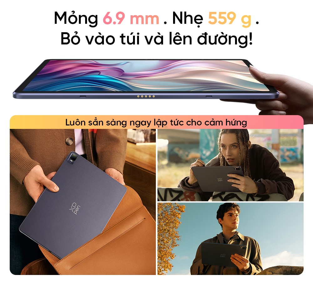 - Dữ liệu được lấy trong điều kiện độ sáng màn hình ở mức 30% và có thể thay đổi tùy thuộc vào môi trường hoạt động. d. Sáng tạo mọi lúc, mọi nơi Thoát khỏi sự trói buộc vào bàn làm việc: Linh hoạt, dễ dàng làm việc theo cách của bạn. Từ ngồi làm việc thoải mái trên ghế sofa đến dễ dàng mang bảng vẽ Xp-pen Magic Drawing Pad ra hiên nhà, quán cà phê, hoặc bất cứ nơi nào bạn muốn. e. Hãy làm việc theo cách của bạn