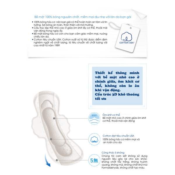 Với thiết kế đặc biệt dành riêng cho ban đêm như: rãnh chống tràn an toàn bề mặt mềm mịn (lưới lụa cao cấp giúp thấm hút nhanh chống thấm ngược nếp gấp 2 lần… tạo