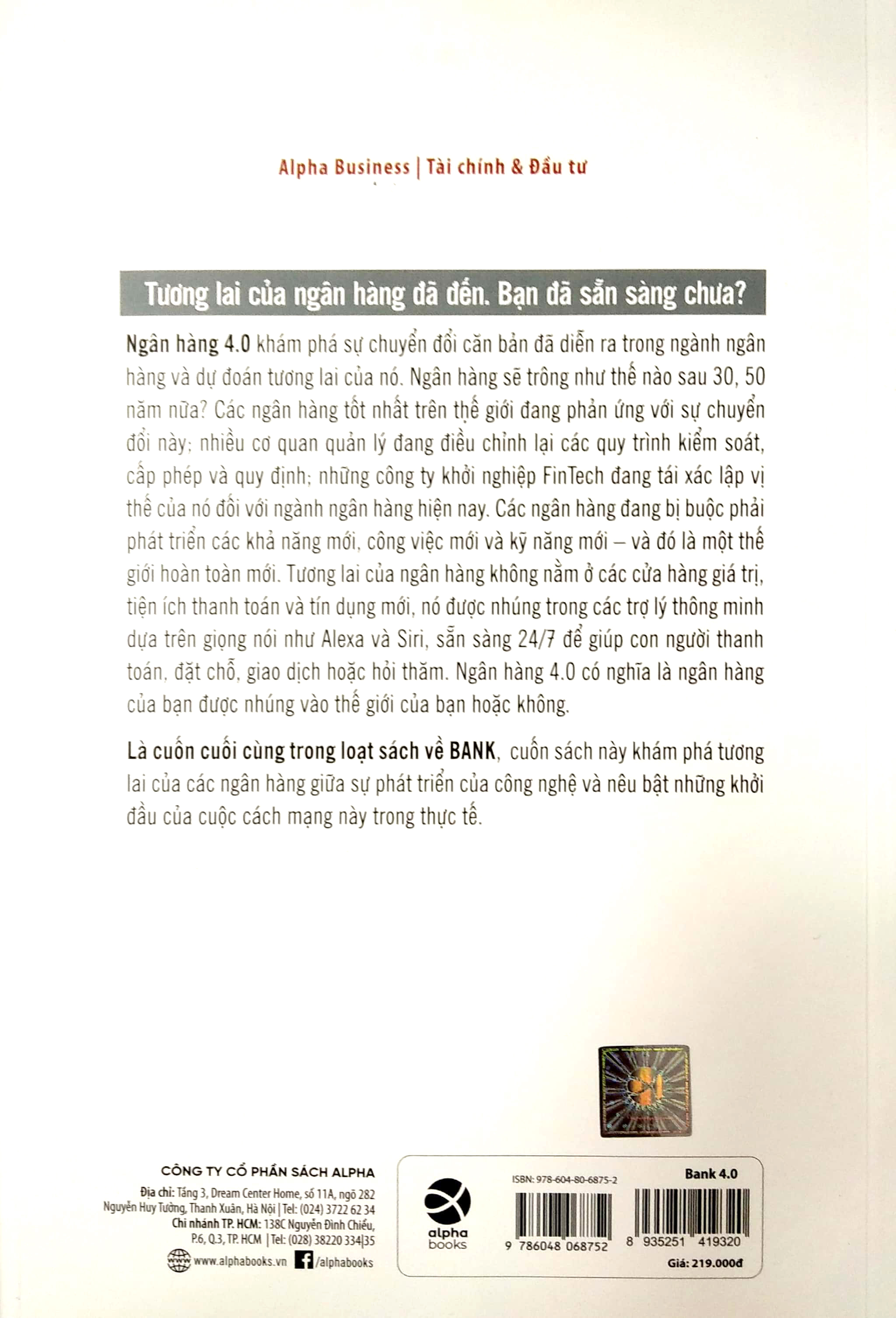 BANK 4.0 - Ngân Hàng Số: Giao Dịch Mọi Nơi, Không Chỉ Ở Ngân Hàng Cuốn sách là phần cuối cùng trong loạt sách về ngân hàng, cuốn sách Bank 4.0 khám phá tương lai