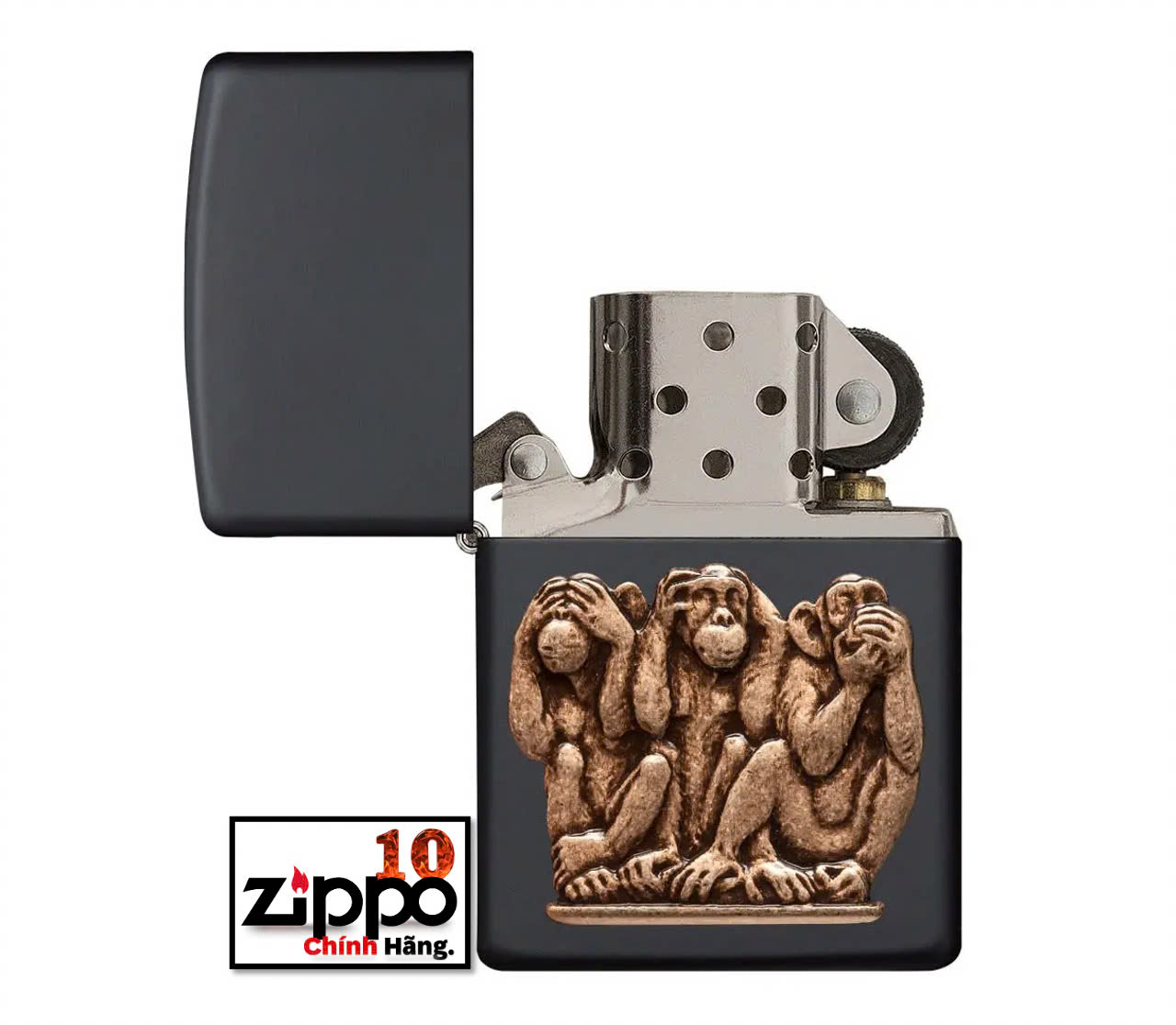 Thấy không có ác. Không nghe thấy điều ác. Nói không ngoa. Một cách thực hiện mới của lời khuyên lâu đời từ các loài linh trưởng ba chiều đã được đúc bằng đồng thau nguyên khối và đặt trên một chiếc bật lửa đen mờ cổ điển. Được đóng gói trong một hộp đựng dạng quà tặng. Để tối ưu hiệu suất, hãy dùng nhiên liệu bật lửa của Zippo.