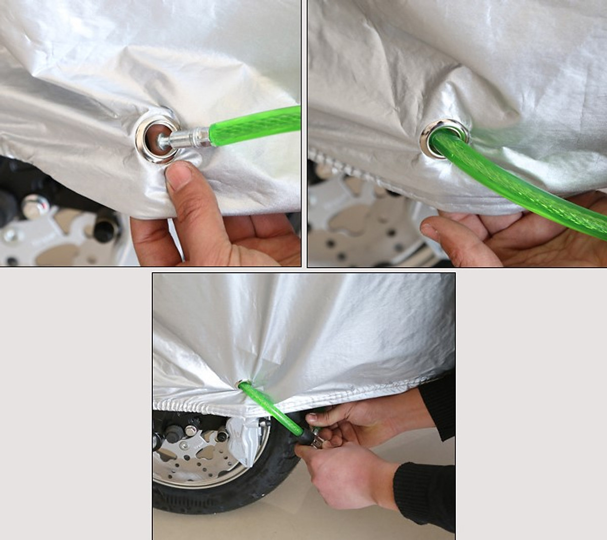• Sản phẩm có khoan lỗ khóa và cán inox, giúp khách hàng có thể mua thêm khóa chữ U hoặc khóa càng, để xỏ lại vừa tiện lợi bảo vệ xe vừa tiện lợi chống mất trộm bạt ô tô. - Chú ý: Sản phẩm KHÔNG có tai trùm gương riêng biệt (tùy theo lô sản xuất) mong quý khách thông cảm