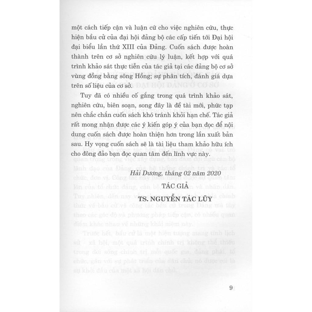 Cuốn sách khái quát một số vấn đề lý luận về bầu cử nói chung; khảo sát, phân tích, đánh giá những kết quả đạt được, những vấn đề còn tồn tại trong công tác bầu cử ở đại hội cơ sở của một số địa phương vùng đồng bằng sông Hồng; trên cơ sở những hướng dẫn, chỉ đạo của Trung ương Đảng, tác giả đề xuất một số giải pháp mà các cơ sở đảng cần thực hiện tốt để công tác bầu cử thực sự mang lại hiệu quả thiết thực nhất, góp phần vào thành công của đại hội đảng bộ các cấp, tiến tới Đại hội đại biểu toàn quốc lần thứ XIII của Đảng. Qua đó, cung cấp cho bạn đọc, nhất là đội ngũ cán bộ lãnh đạo ở cơ sở những luận cứ mang tính lý luận và thực tiễn về hoạt động bầu cử trong Đảng.