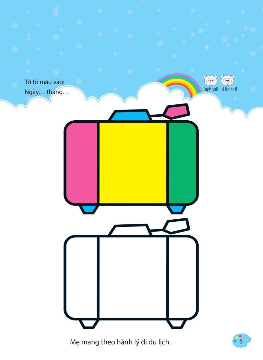 Ngoài việc tô màu theo sự sáng tạo riêng của mỗi bé, sách có gợi ý màu sắc, hình tô mẫu để các bé có thể dễ tưởng tượng và ghi nhớ được hình dạng và màu sắc.