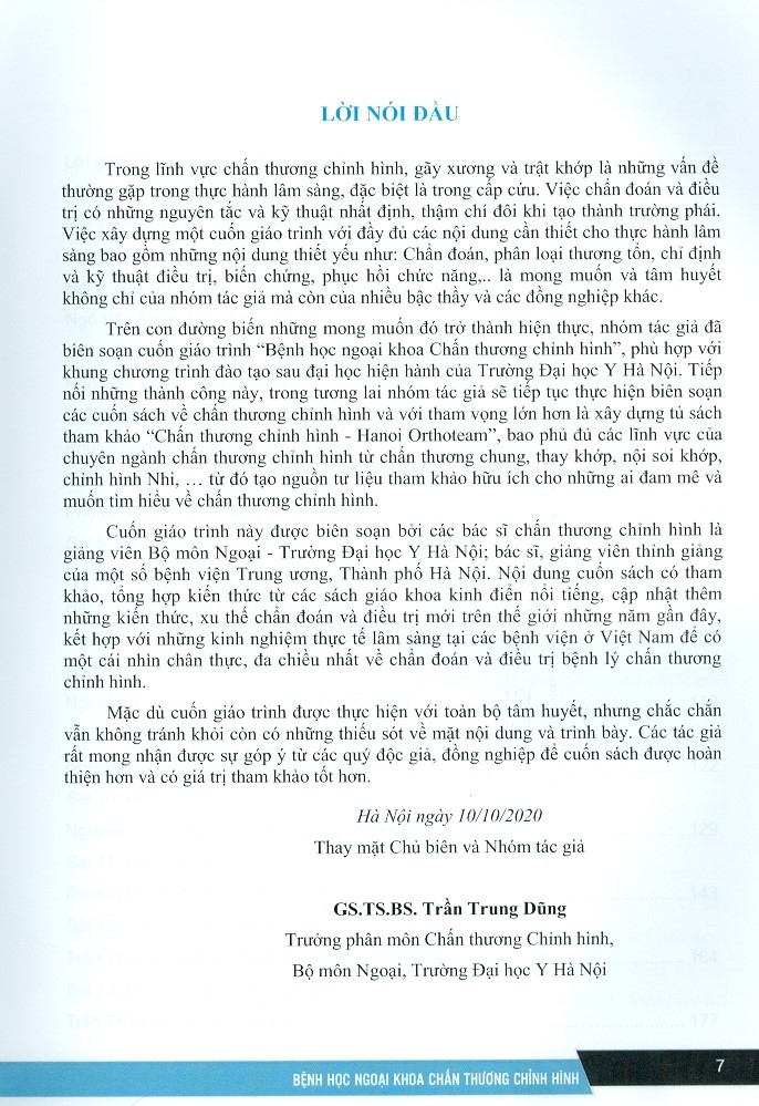 Trong lĩnh vực chấn thương chỉnh hình, gãy xương và trật khớp là những vấn đề thường gặp trong thực hành lâm sàng, đặc biệt là trong cấp cứu. Việc chẩn đoán và điều trị có những nguyên tắc và kỹ thuật nhất định, thậm chí đôi khi tạo thành trường phái. Việc xây dựng một cuốn giáo trình với đầy đủ các nội dung cần thiết cho thực hành lâm sàng bao gồm những nội dung thiết yếu như: Chẩn đoán, phân loại thương tổn, chỉ định và kỹ thuật điều trị, biến chứng, phục hồi chức năng, là mong muốn và tâm huyết không chỉ của nhóm tác giả mà còn của nhiều bậc thầy và các đồng nghiệp khác. Trên con đường biến những mong muốn đó trở thành hiện thực, nhóm tác giả đã biên soạn cuốn giáo trình “Bệnh học ngoại khoa Chấn thương chỉnh hình”, phù hợp với khung chương trình đào tạo sau đại học hiện hành của Trường Đại học Y Hà Nội. Tiếp nối những thành công này, trong tương lai nhóm tác giả sẽ tiếp tục thực hiện biên soạn các cuốn sách về chấn thương chỉnh hình và với tham vọng lớn hơn là xây dựng tủ sách tham khảo “Chấn thương chỉnh hình - Hanoi Orthoteam”, bao phủ đủ các lĩnh vực của chuyên ngành chấn thương chỉnh hình từ chấn thương chung, thay khớp, nội soi khớp, chỉnh hình Nhi, … từ đó tạo nguồn tư liệu tham khảo hữu ích cho những ai đam mê và muốn tìm hiểu về chấn thương chỉnh hình. Cuốn giáo trình này được biên soạn bởi các bác sĩ chấn thương chỉnh hình là giảng viên Bộ môn Ngoại - Trường Đại học Y Hà Nội; bác sĩ, giảng viên thỉnh giảng của một số bệnh viện Trung ương, Thành phố Hà Nội. Nội dung cuốn sách có tham khảo, tổng hợp kiến thức từ các sách giáo khoa kinh điển nổi tiếng, cập nhật thêm những kiến thức, xu thế chẩn đoán và điều trị mới trên thế giới những năm gần đây, kết hợp với những kinh nghiệm thực tế lâm sàng tại các bệnh viện ở Việt Nam để có một cái nhìn chân thực, đa chiều nhất về chẩn đoán và điều trị bệnh lý chấn thương chỉnh hình.
