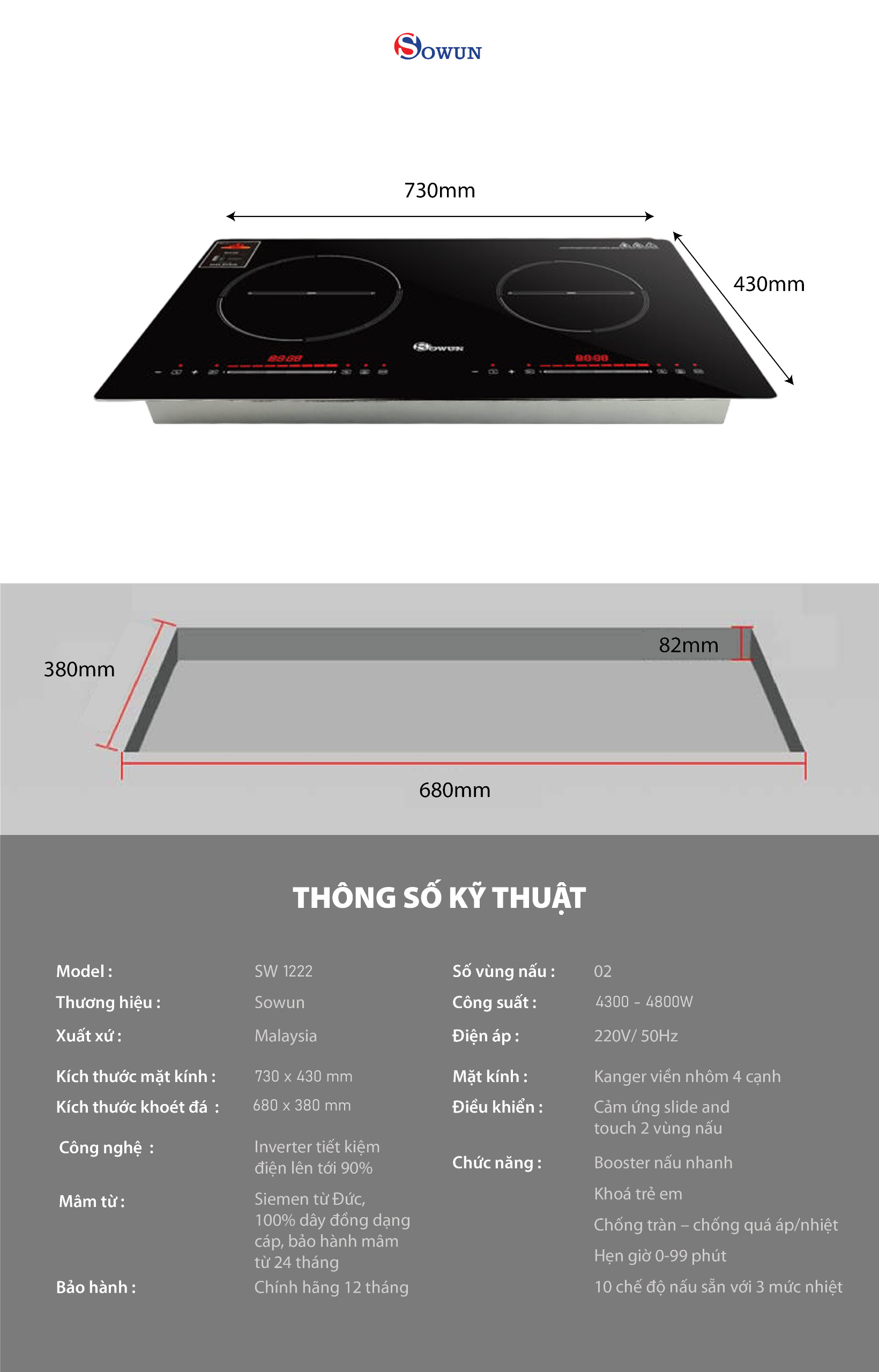 Model SW 1222 Thương hiệu Sowun Số vùng nấu 02 Tổng công suất 4800W Công suất bếp trái 2500W Công suất tối đa Booster bếp trái 2800W Công suất bếp phải 1800W Công suất tối đa Booster bếp phải 2000W Điện áp 220-240V/50-60Hz Công nghệ Inverter Có Bảng điều khiển Phím cảm ứng trượt, kết hợp bấm Số bảng điều khiển 02 Mức công suất điều chỉnh nhiệt 09 mức Hẹn giờ Có Chế độ giữ ấm/ rã đông/hầm (70°C, 80°C, 90°C) Có Khóa trẻ em Có Cảnh báo và ngắt chống tràn Có Cảnh báo và ngắt khi quá nhiệt Có Cảnh báo và ngắt nồi cạn Có Ngắt khi không sử dụng Có Kích thước sản phẩm 730x430x88 mm Kích thước cắt kính 680×380 mm Xuất xứ Malaysia MẶT KÍNH CHỊU LỰC, CHỊU NHIỆT CAO
